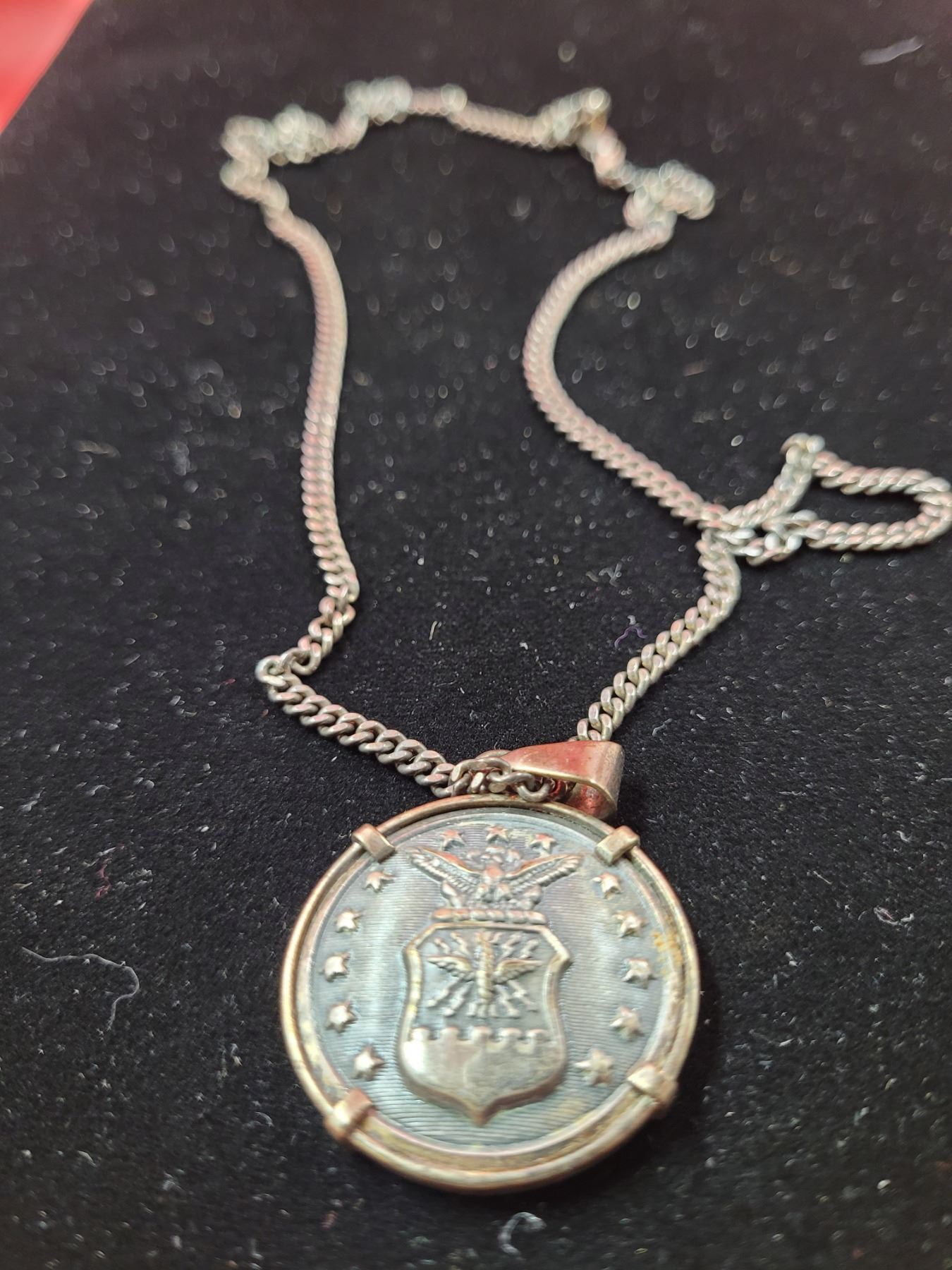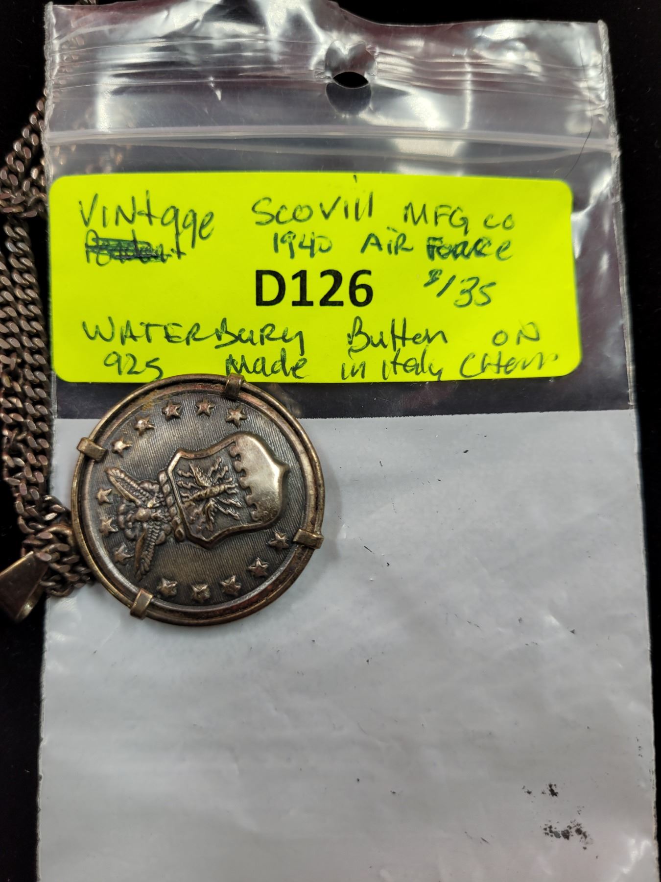 Lot 459 VTG Scovill Mfg Co. 1940s Air Force Waterbury Button on 925 Italian Sterling Chain