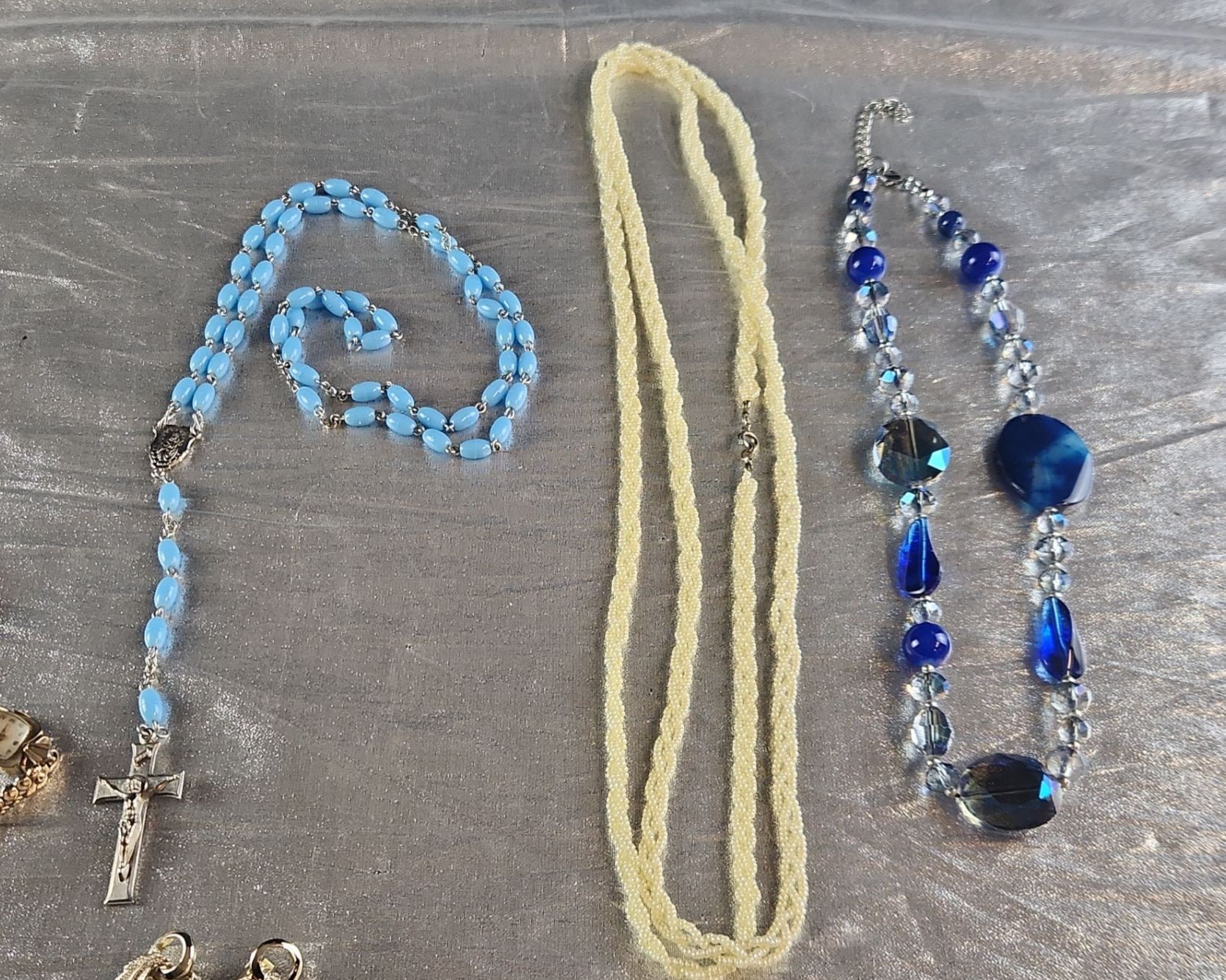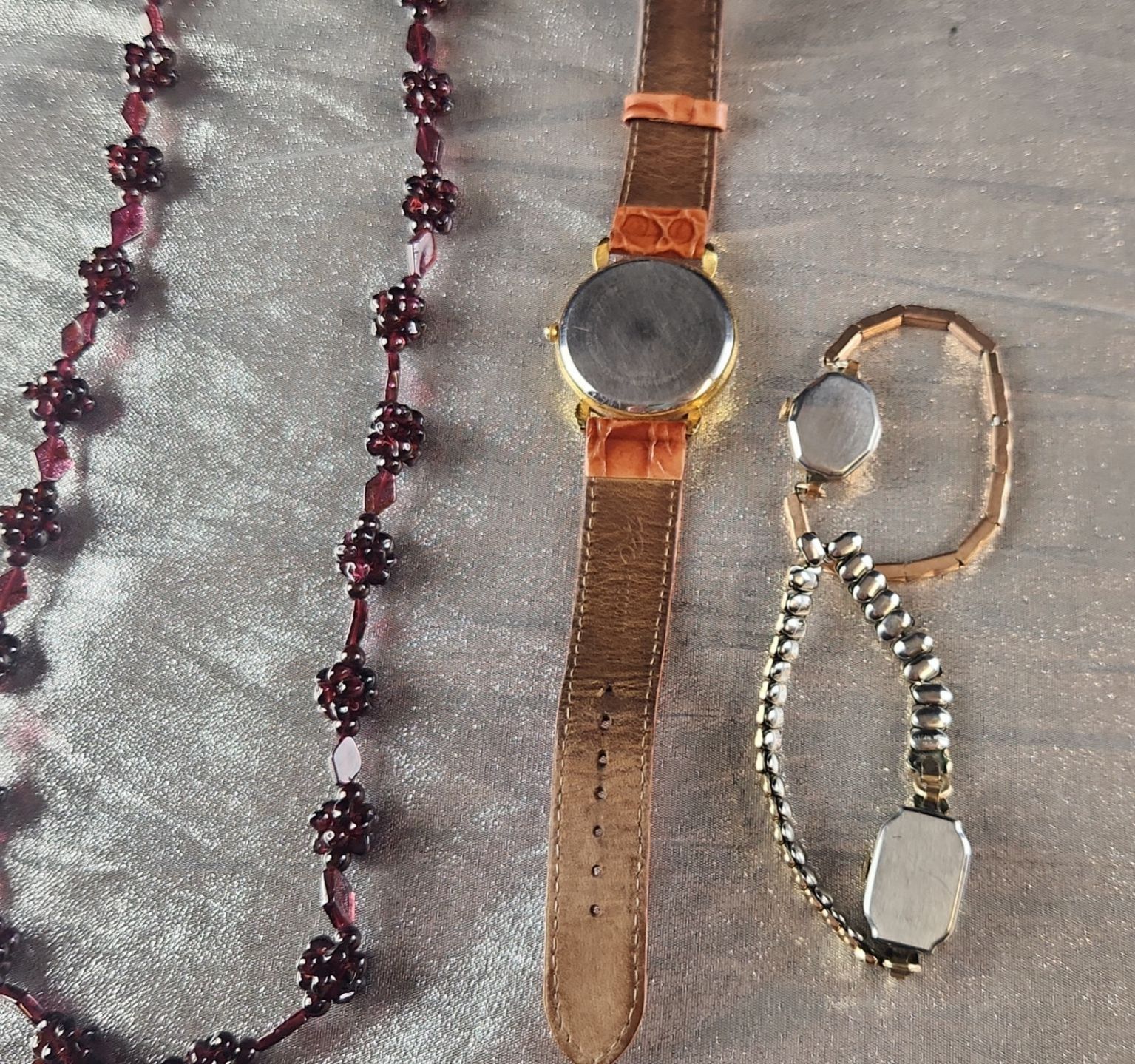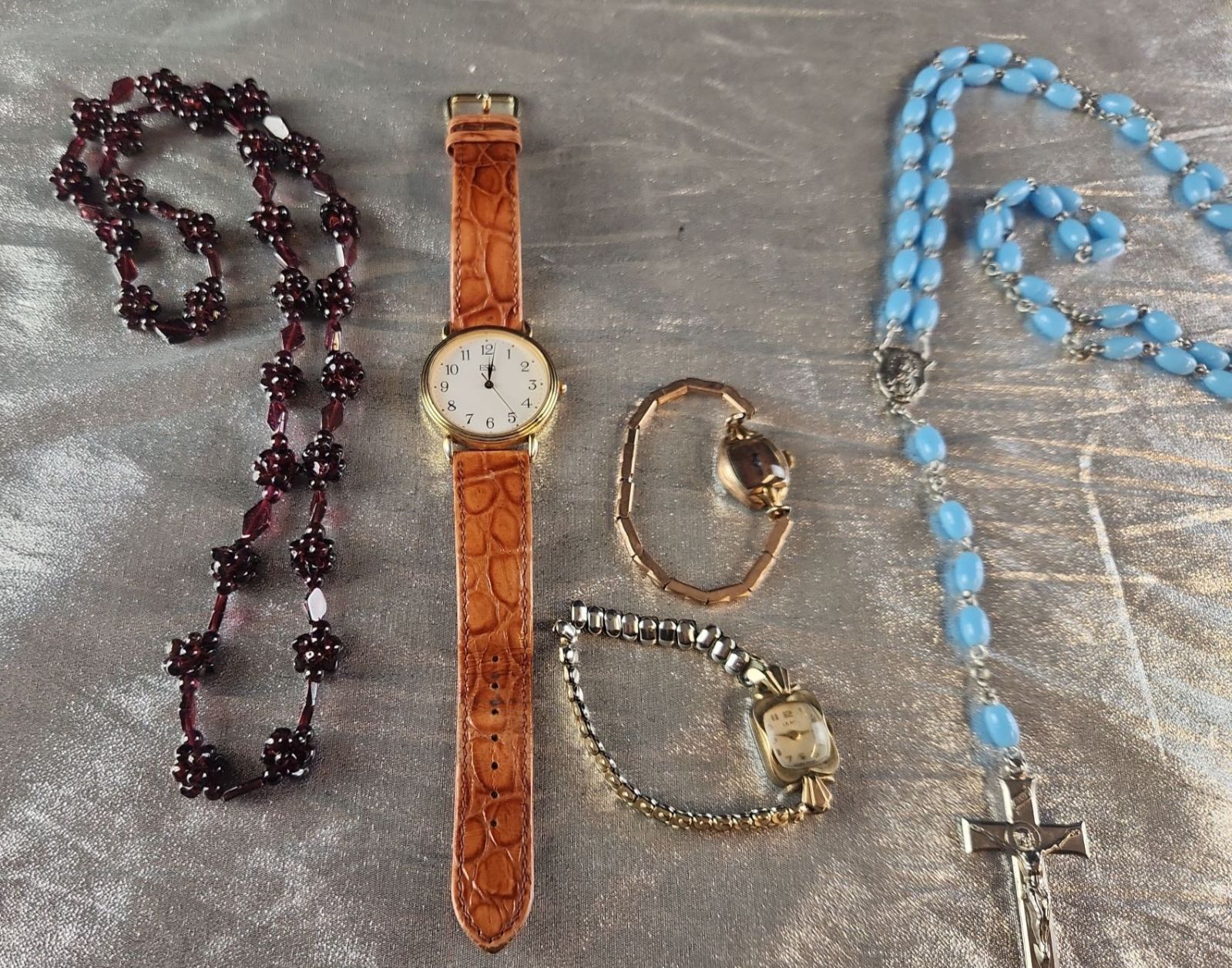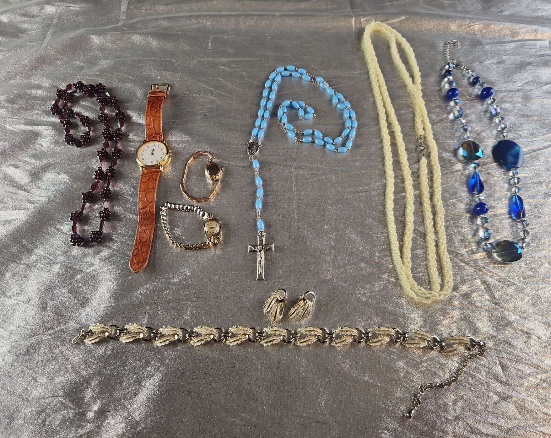This Collection of Vintage Costume Jewelry Includes Various Beaded necklaces, A Rosary, Bracelets, and Wrist Watches