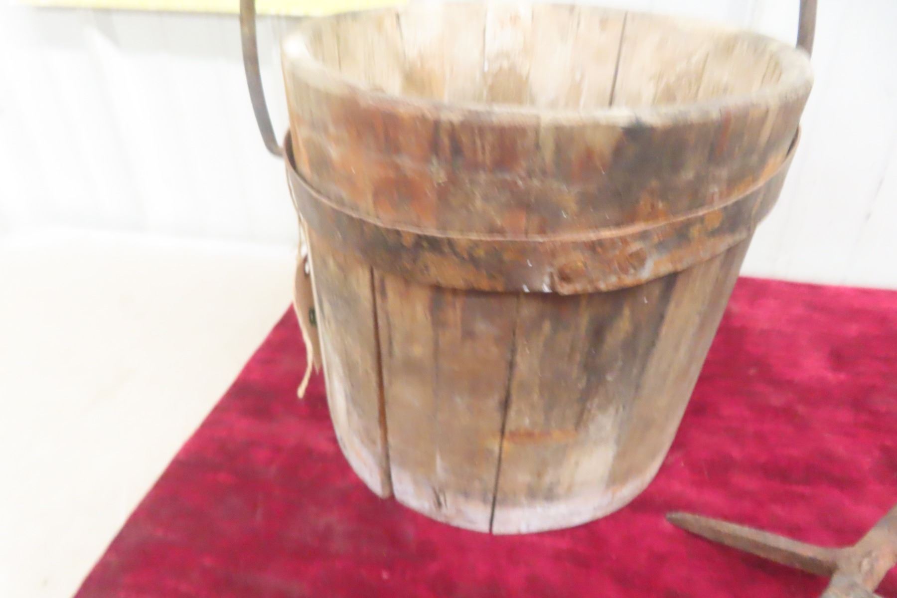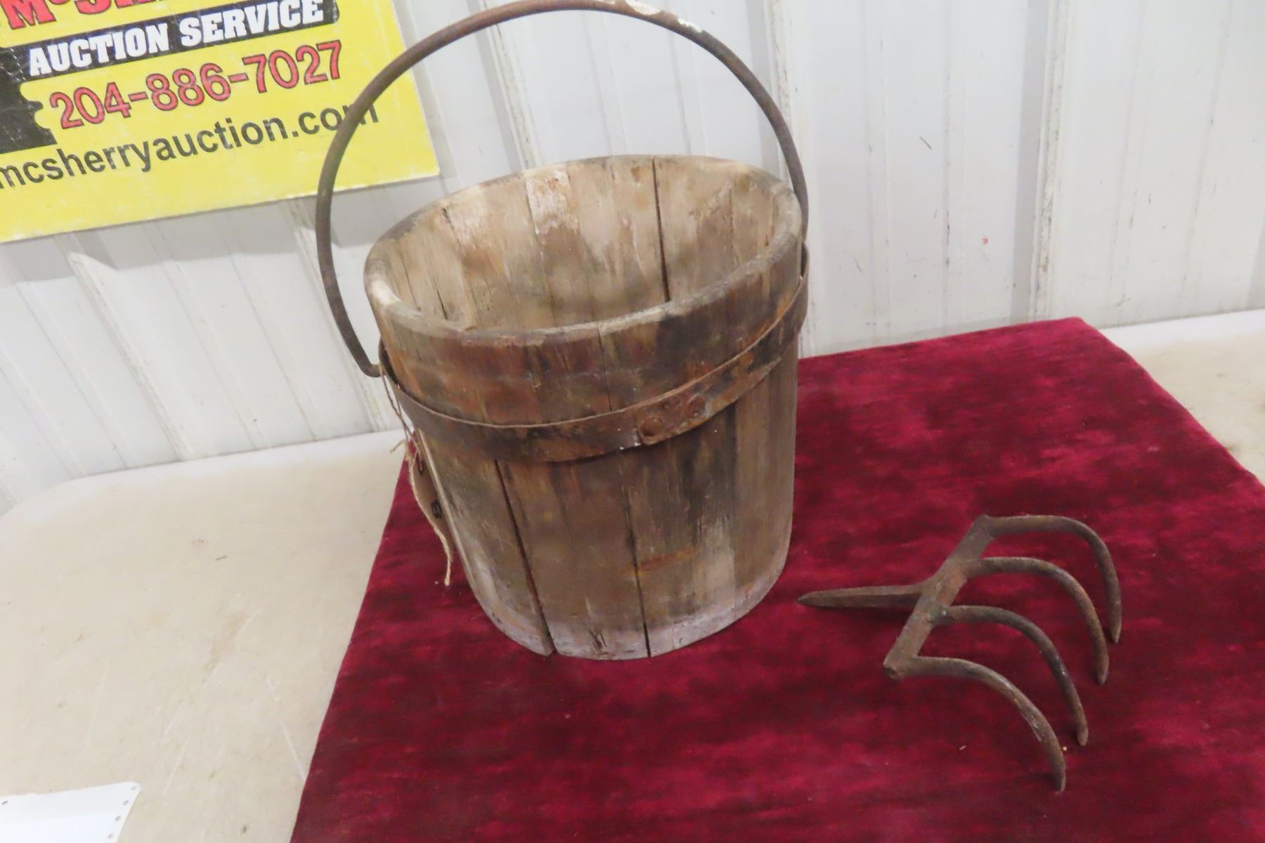 Lot 392 Antique Primitive Old Staved Wooden Bucket Pail with Iron Metal Band Handle; 4-Tine Potato Rake Head