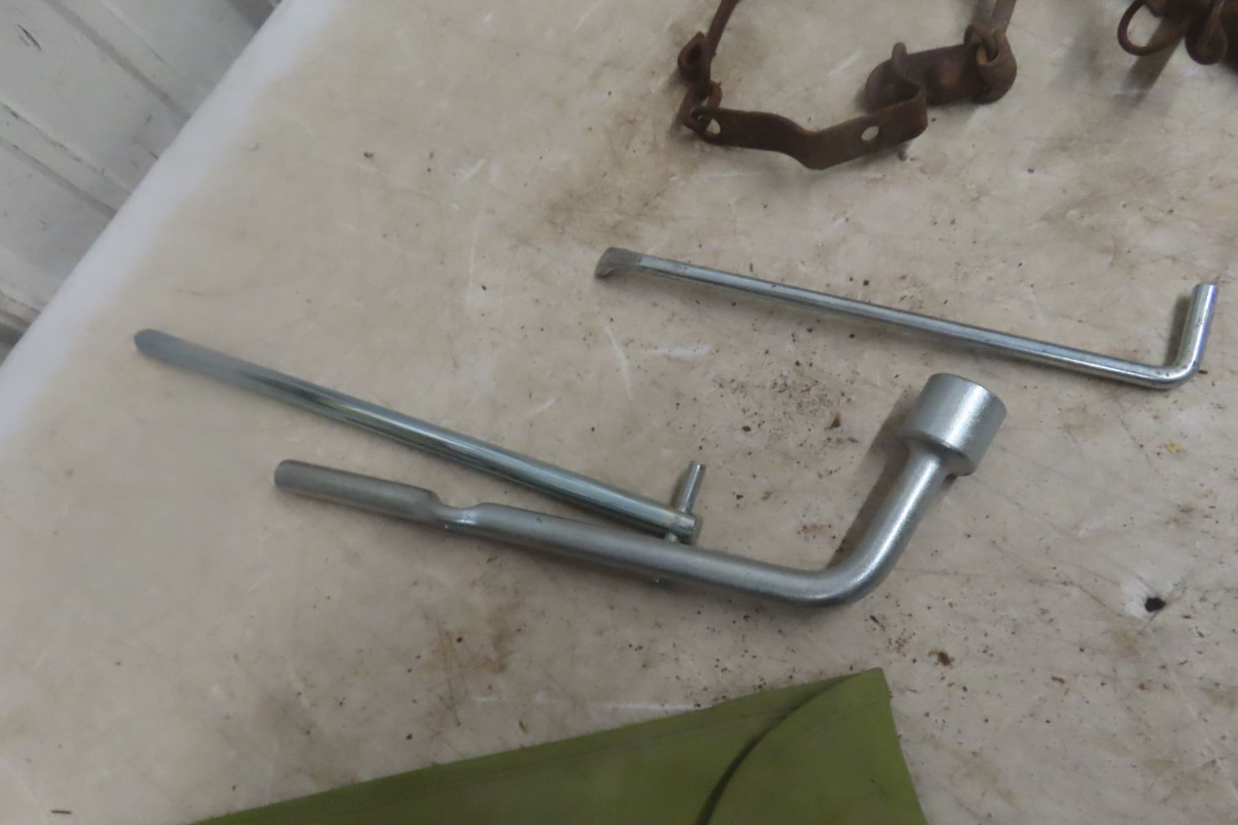 Vintage Toyota Tire Jack, Lug Wrench and Hub Tool Kit in Green Motor Bag, Made in Japan; 2 Antique Ford Model T Auto Tire Chains