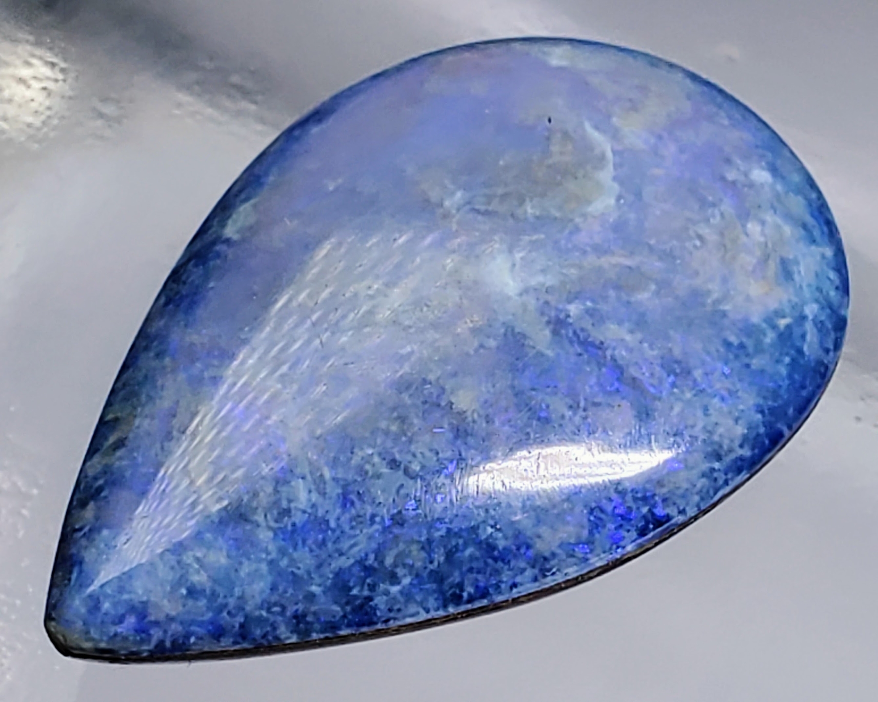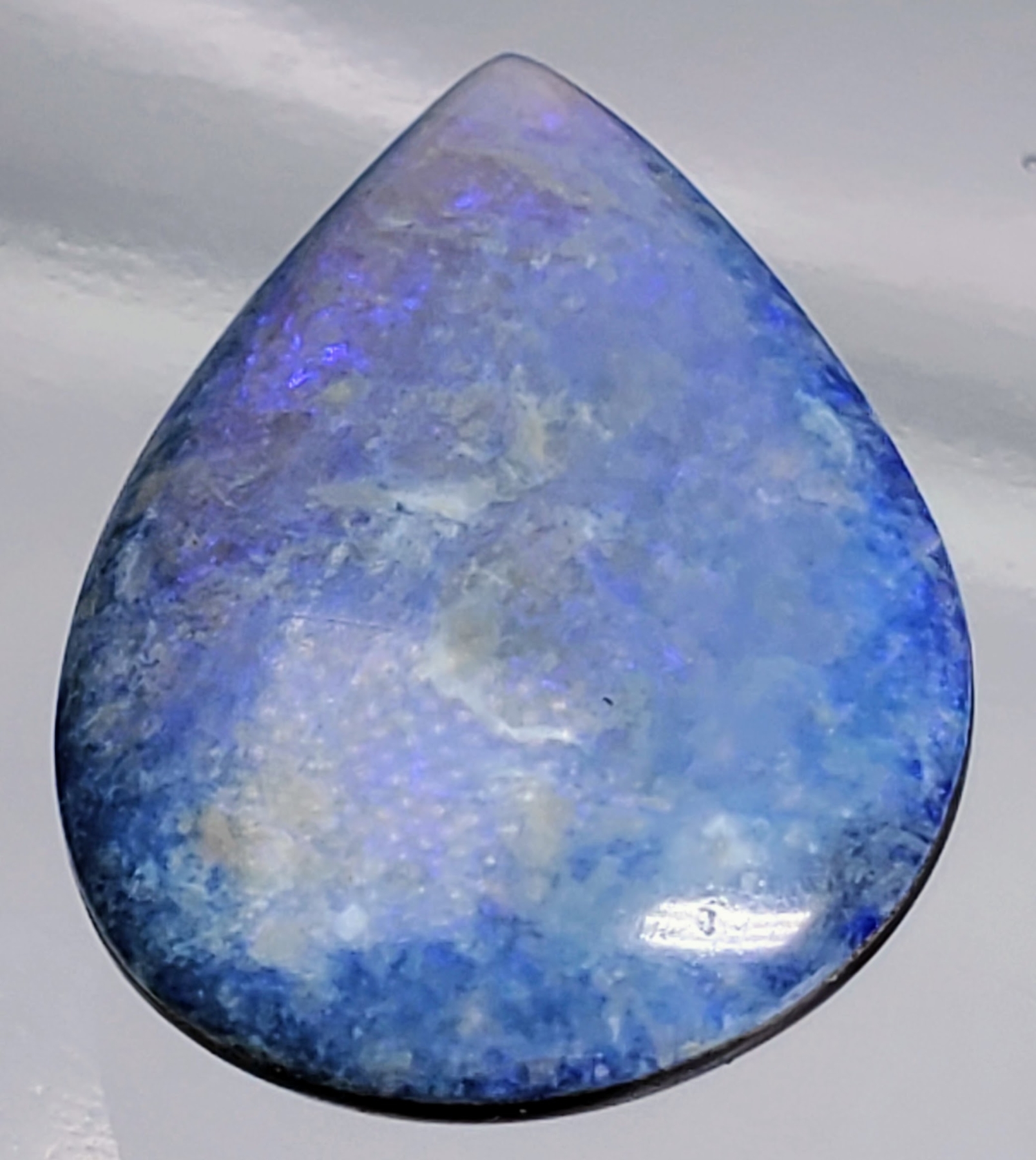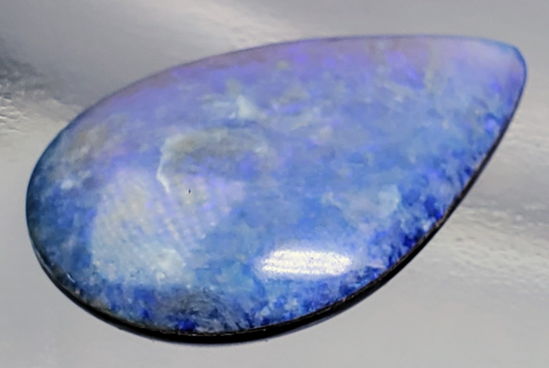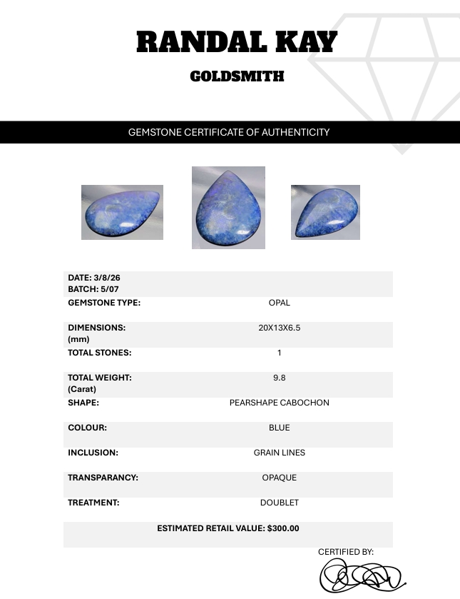 A 9.8-carat blue opal doublet cabochon with grain lines, opaque body, and pear shape. Vibrant color play and polished finish. Estimated retail price is $300.