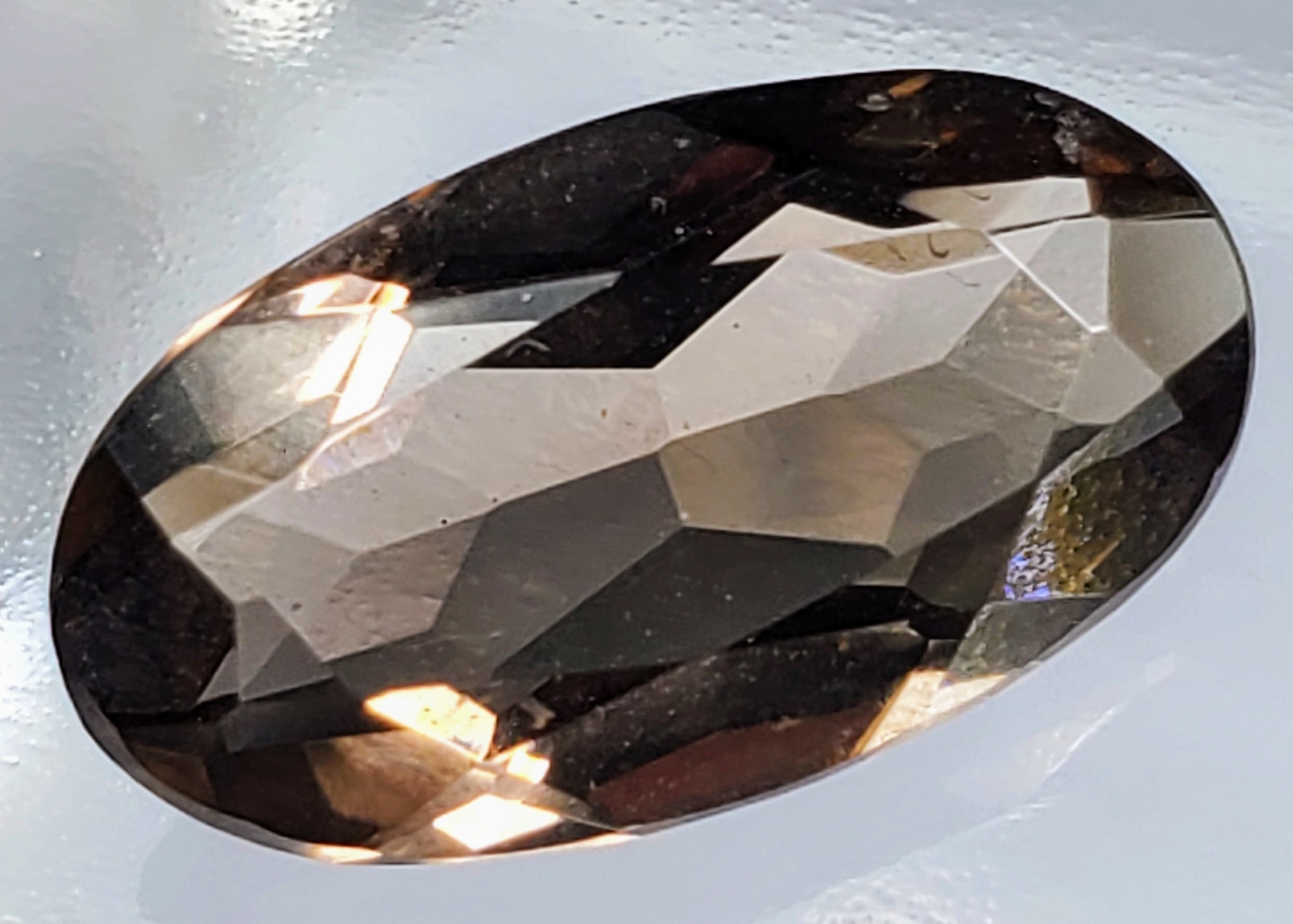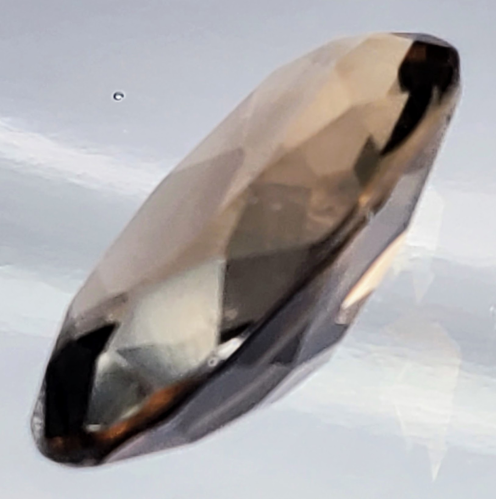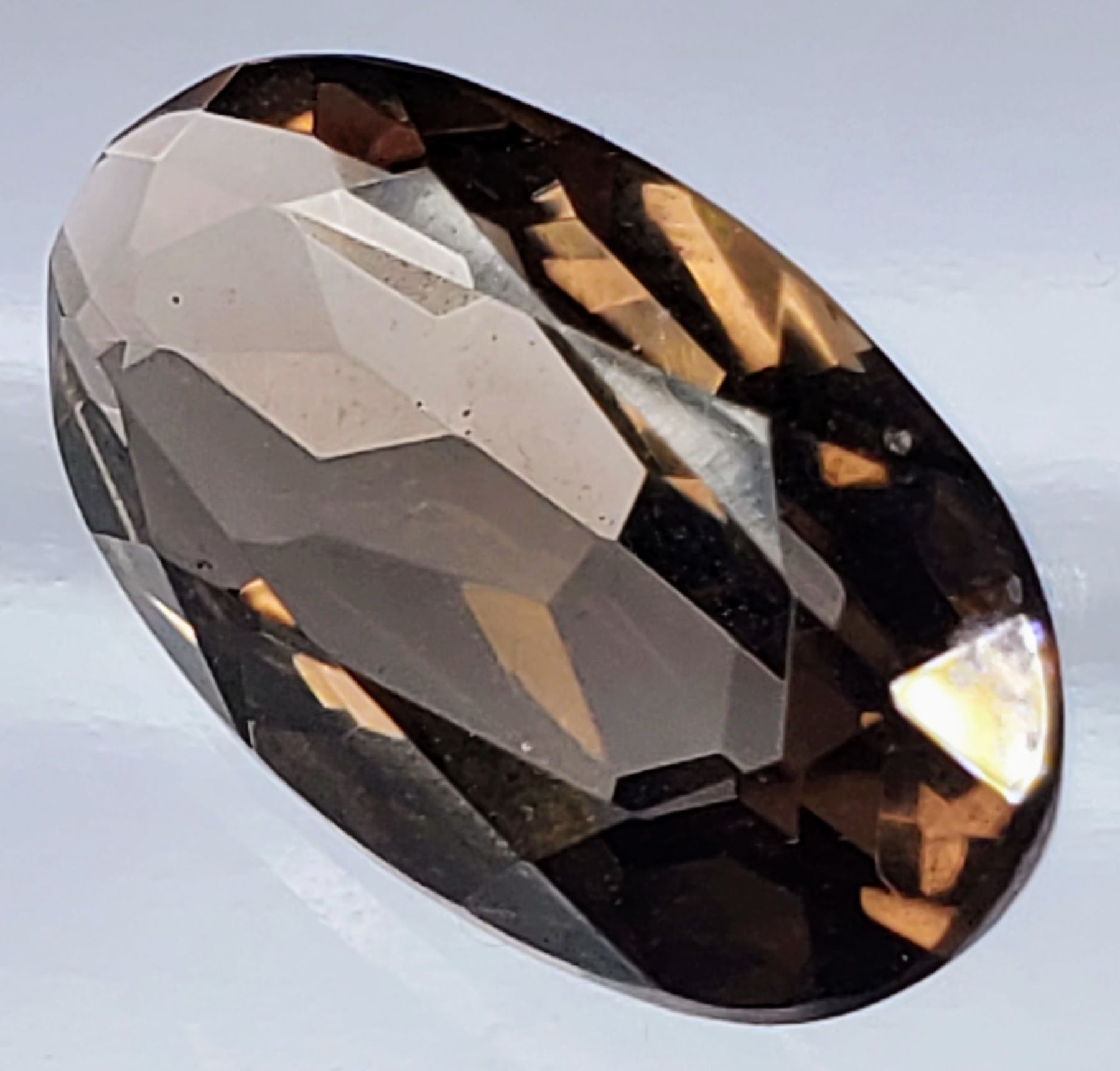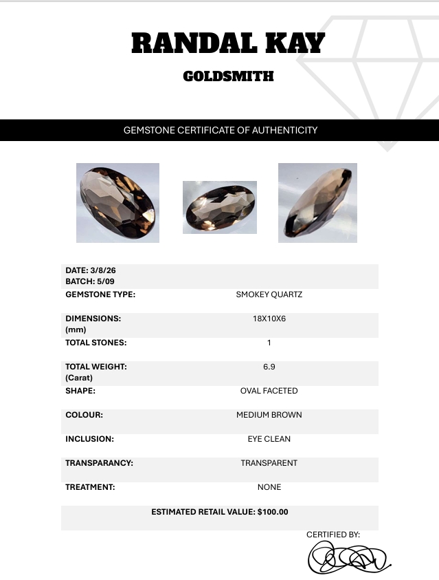 A 6.9-carat medium-brown smokey quartz featuring eye-clean clarity, transparent body, and oval faceting. Untreated with warm earthy brilliance. Estimated retail price is $100.