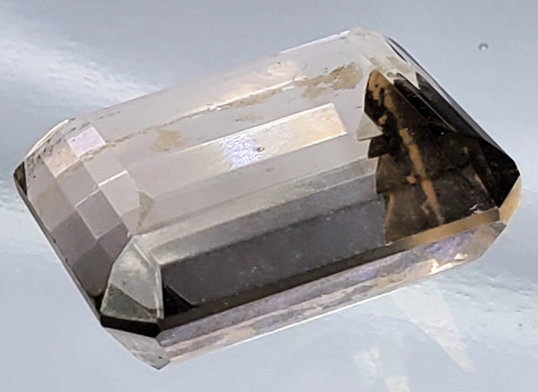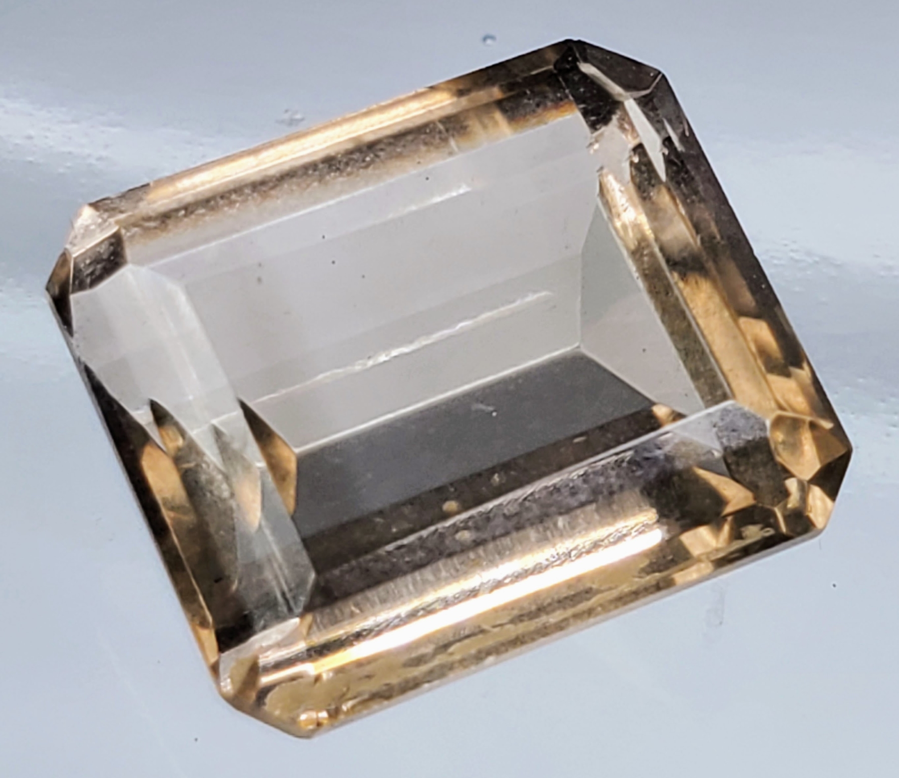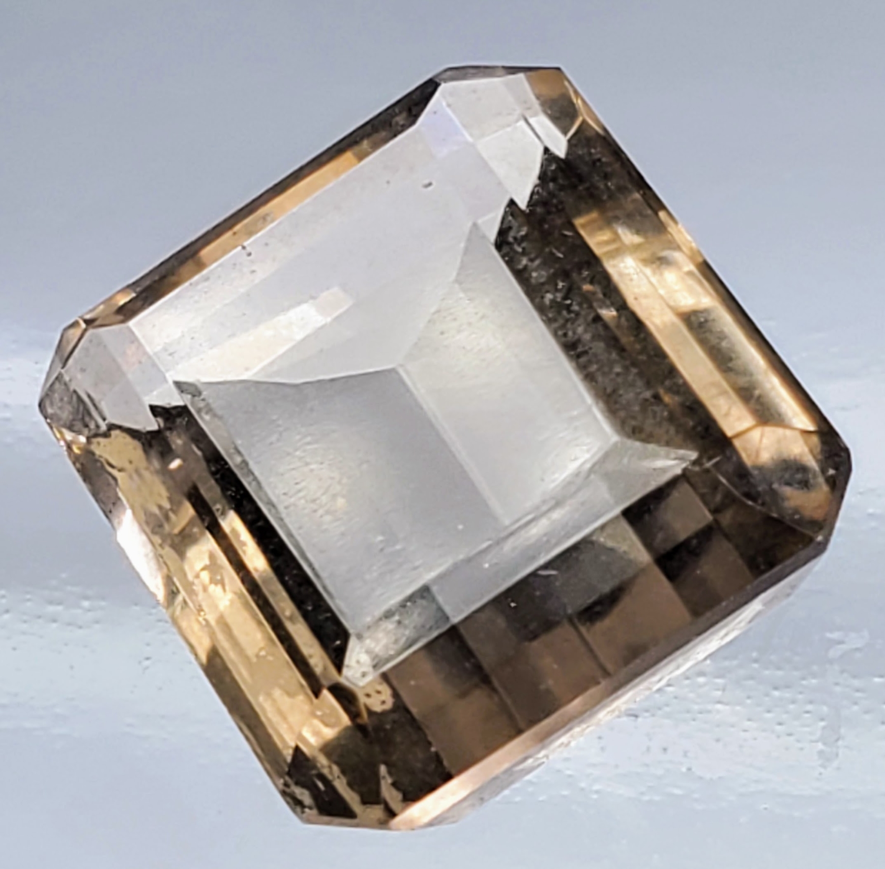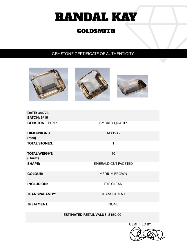 A 10-carat medium-brown smokey quartz with eye-clean clarity, transparent body, and emerald-cut faceting. Untreated and well-proportioned. Estimated retail price is $150.