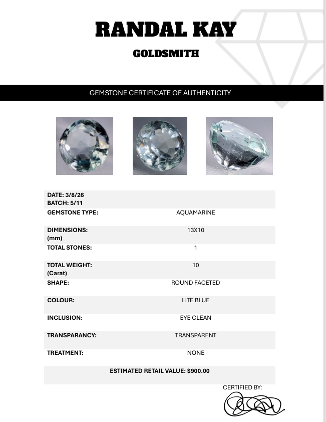 A 10-carat light-blue aquamarine with eye-clean clarity, transparent body, and round faceting. Untreated and bright, offering crisp brilliance. Estimated retail price is $900.