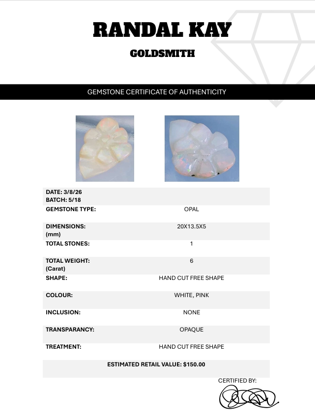 A 6-carat hand-cut opal cabochon featuring white and pink tones, opaque body, and freeform shape. Smooth polish and natural charm. Estimated retail price is $150.