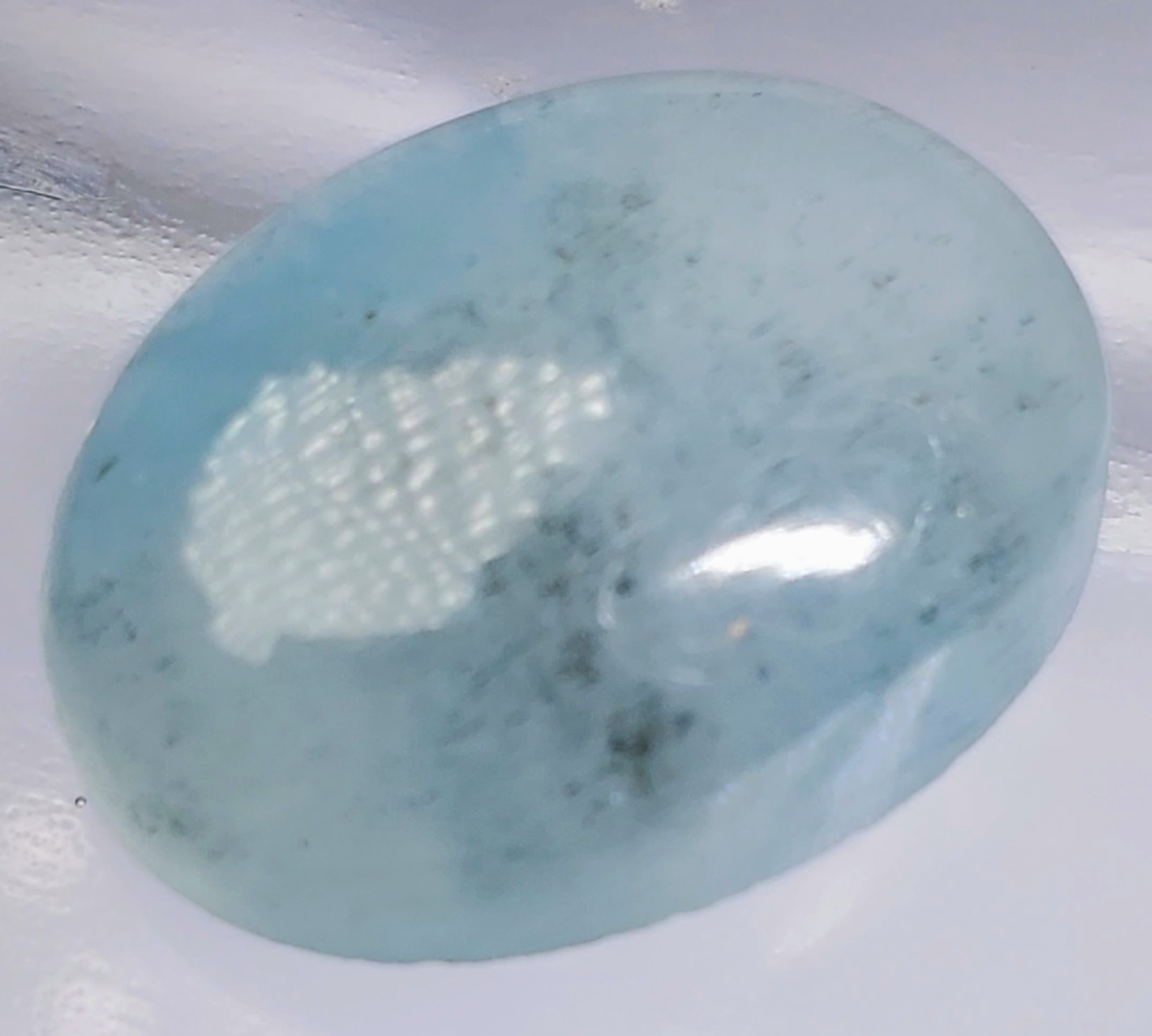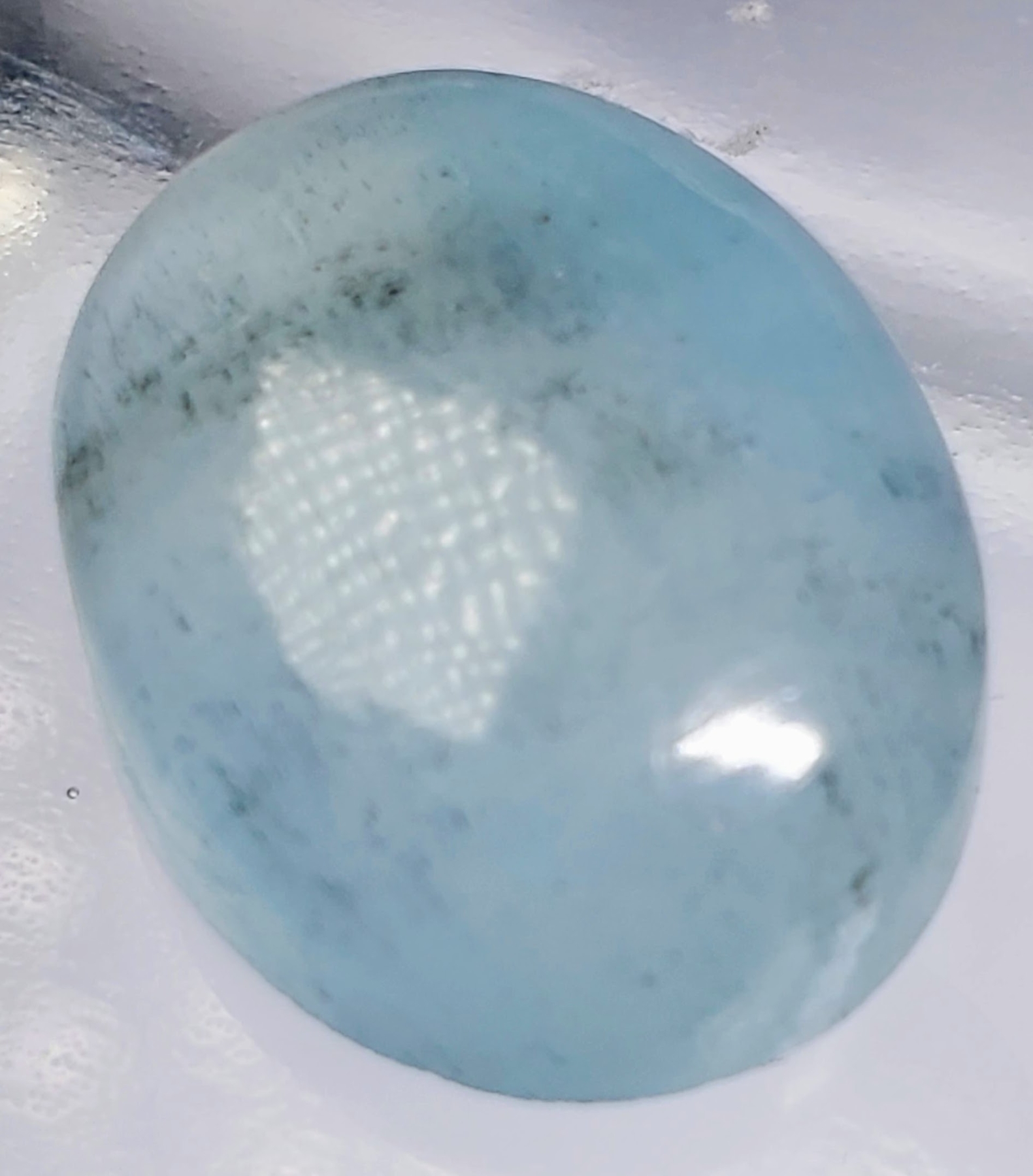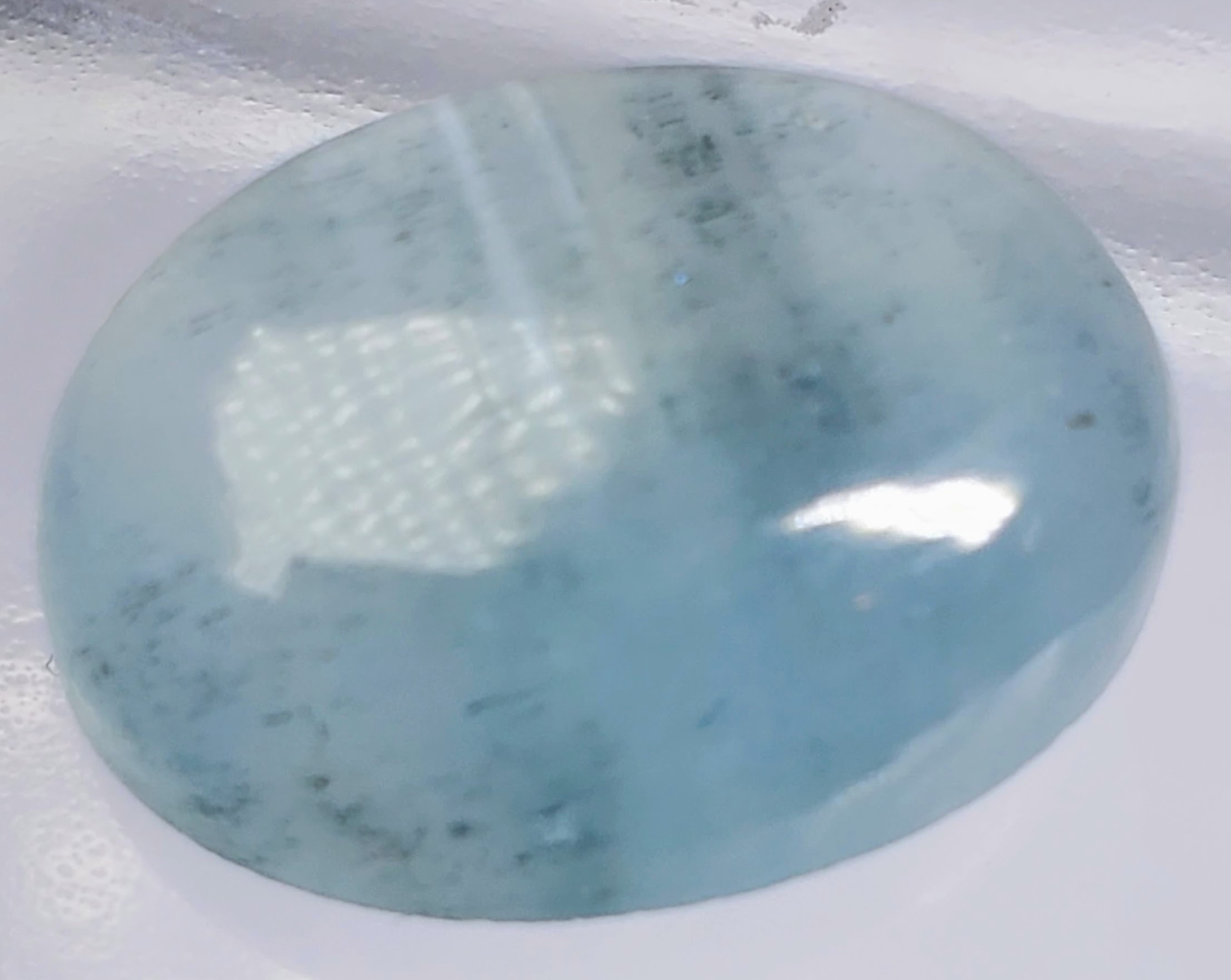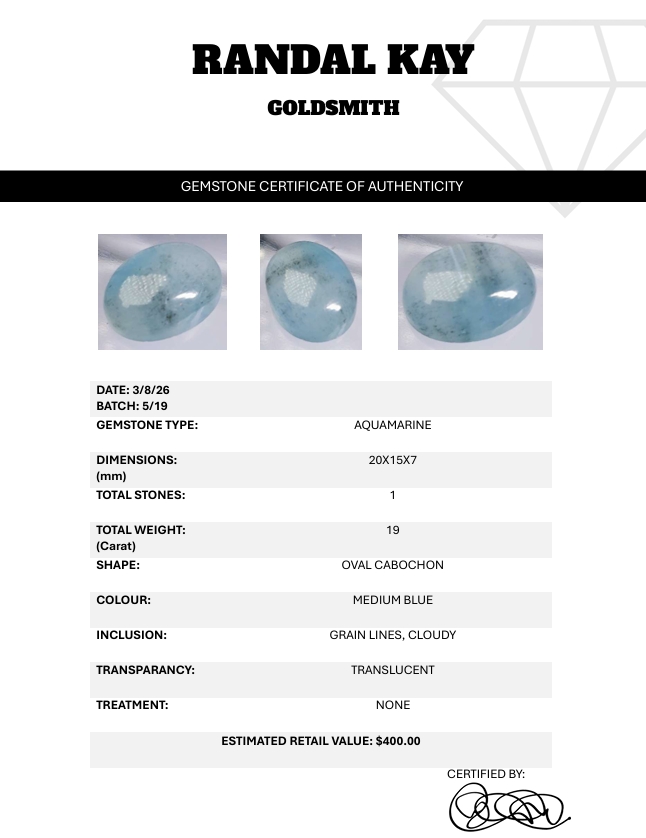 A 19-carat medium-blue aquamarine cabochon with translucent clarity, grain lines, and cloudy texture. Untreated and substantial in size. Estimated retail price is $400.