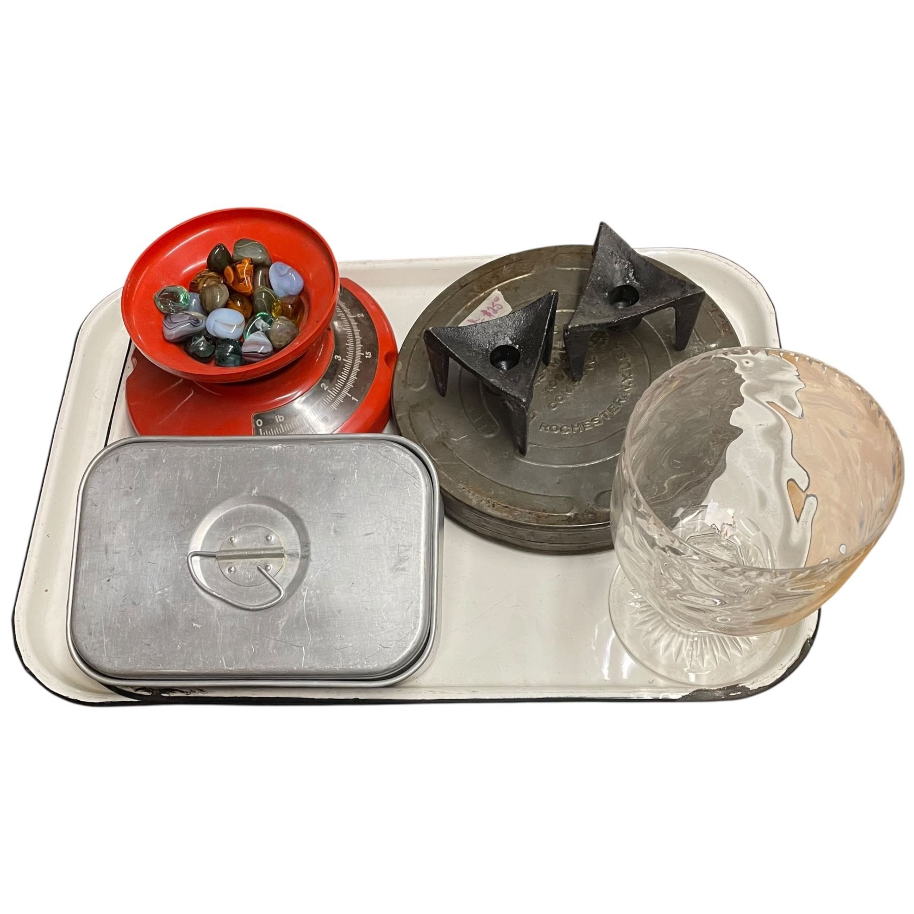 Lot 1238 Assorted Collection of Vintage Items: Enamel Trays, Movie Reel Case, Scale, Polished Stones and Vase