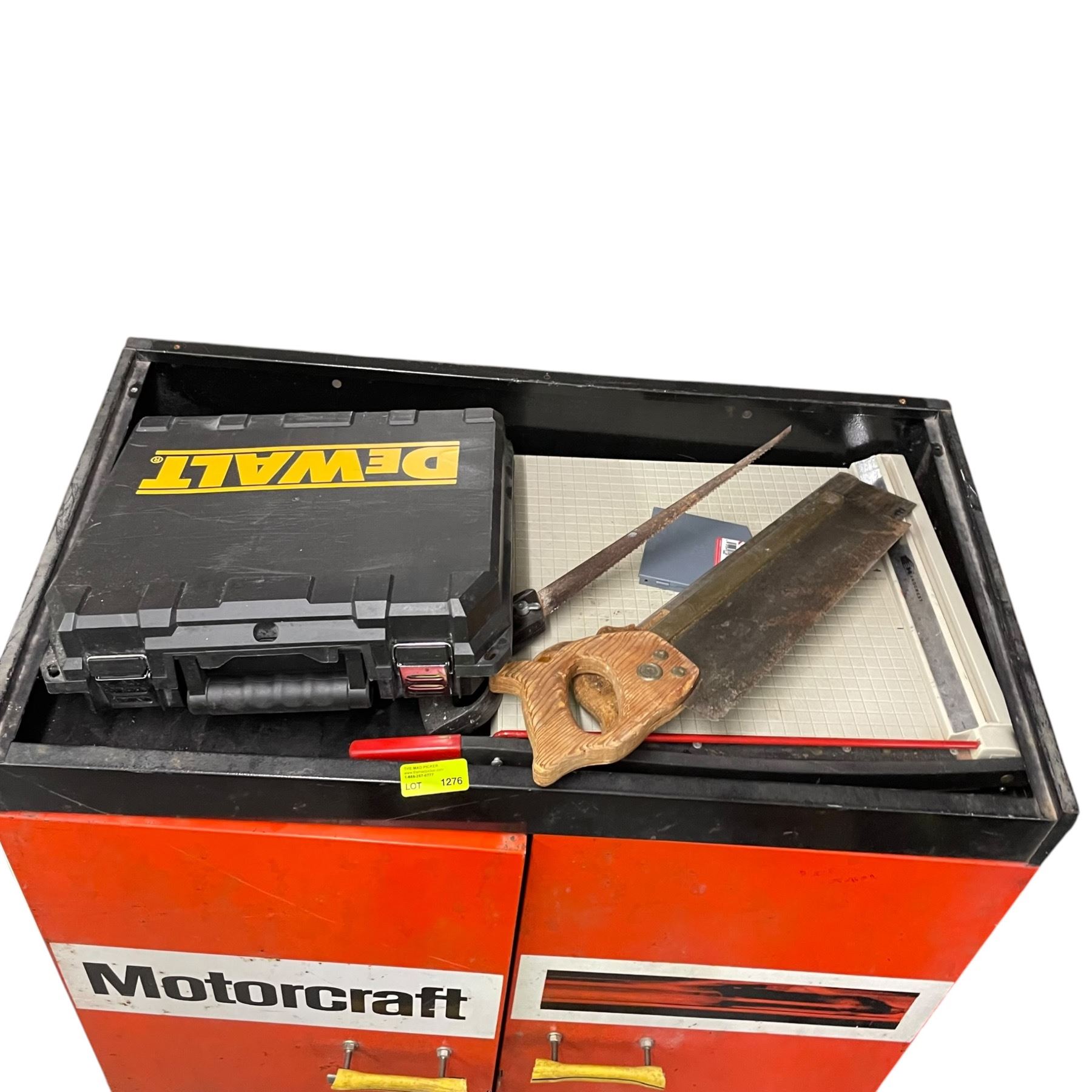 Lot 1276 Motorcraft Metal Storage Cupboard 33x18x14", Saws, DeWalt Drill and Paper Cutter