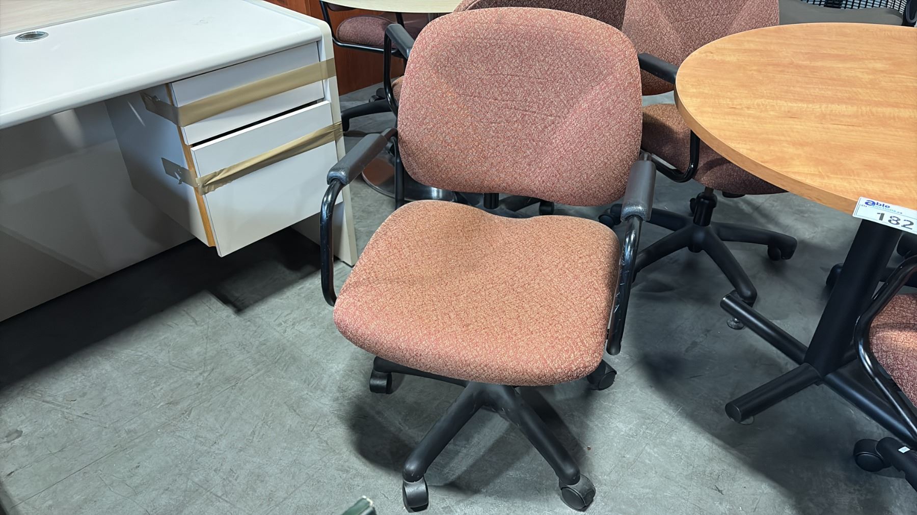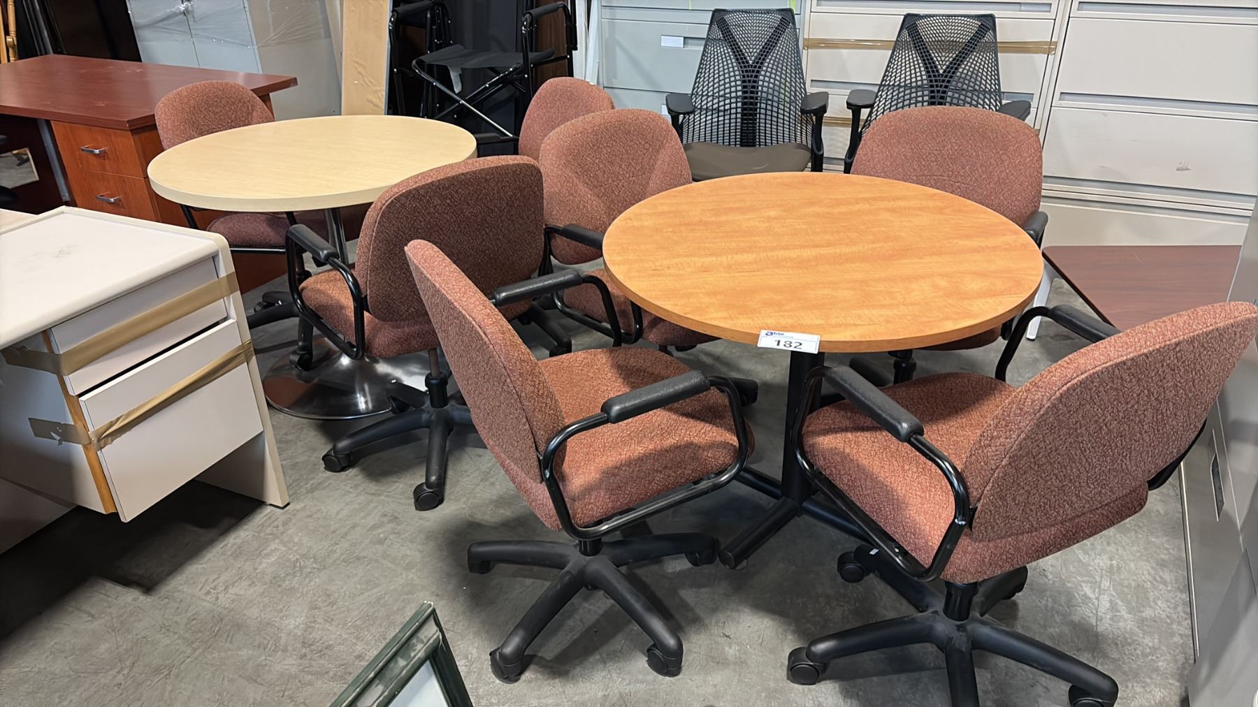 Lot 182 1 MAPLE AND 1 LIGHT MAPLE 30" ROUND TABLE AND 7 ROSE TILTER CHAIRS