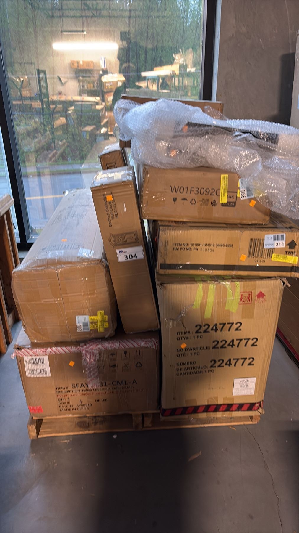 Lot 304 8 READY TO ASSEMBLE FURNITURE INCL BRASS SCONCE, WALL CLOCK, BAR STOOL AND MORE