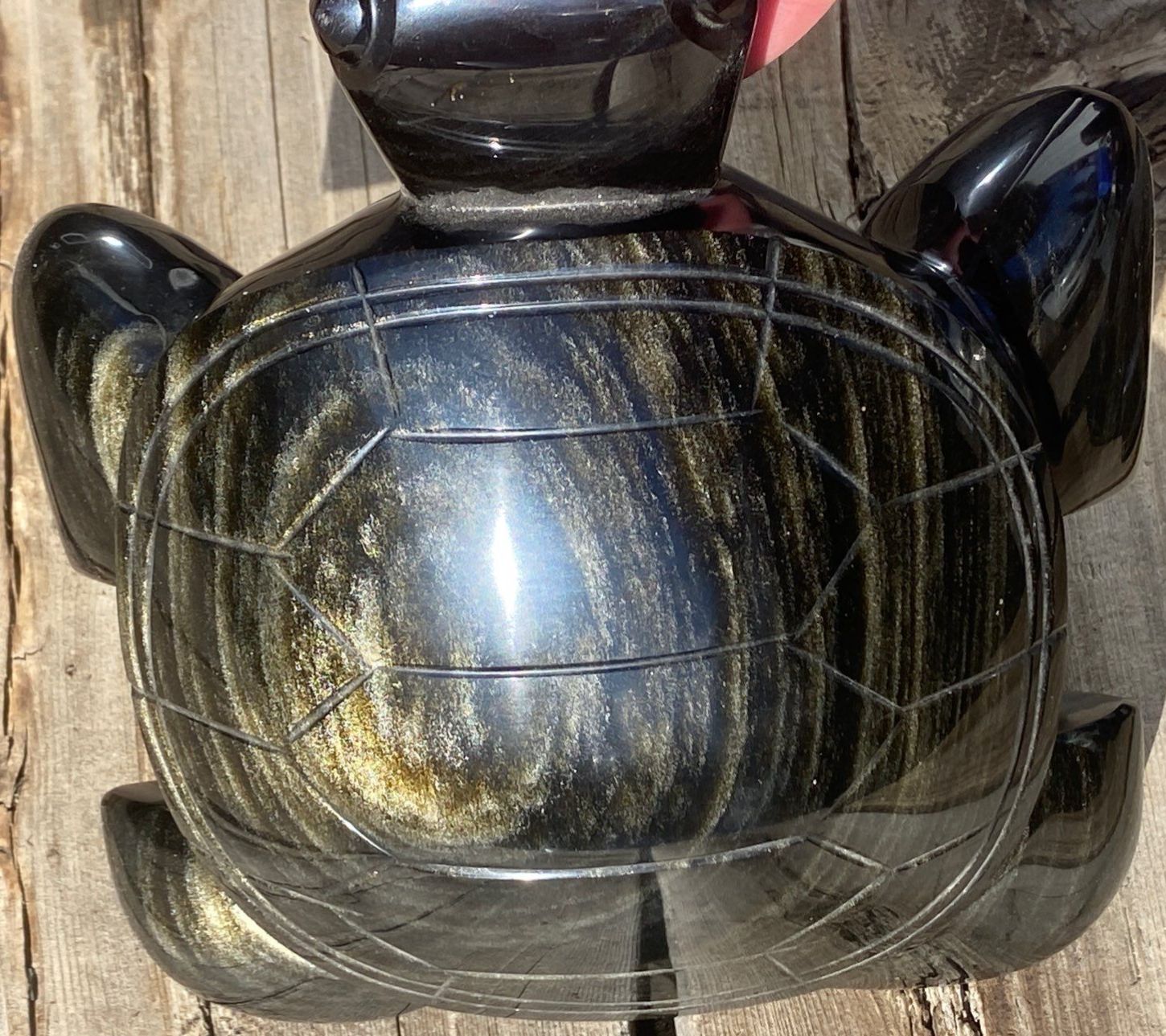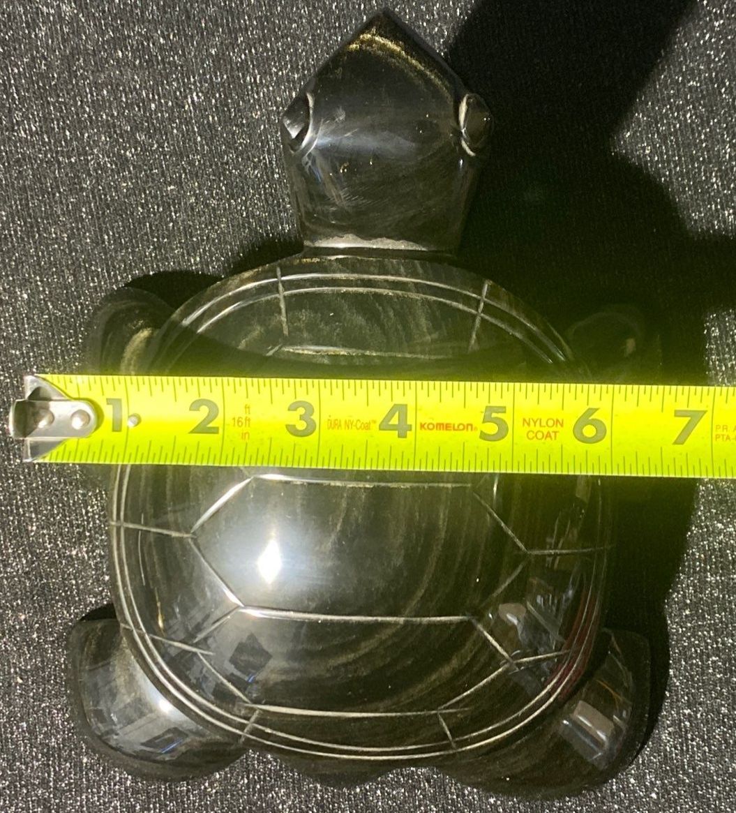 A truly eye-catching statement piece, this large hand-carved black obsidian Aztec turtle statue showcases exceptional craftsmanship and natural beauty. Weighing approximately 6 pounds, it has a substantial, solid feel, making it a standout addition to any collection or décor setting.