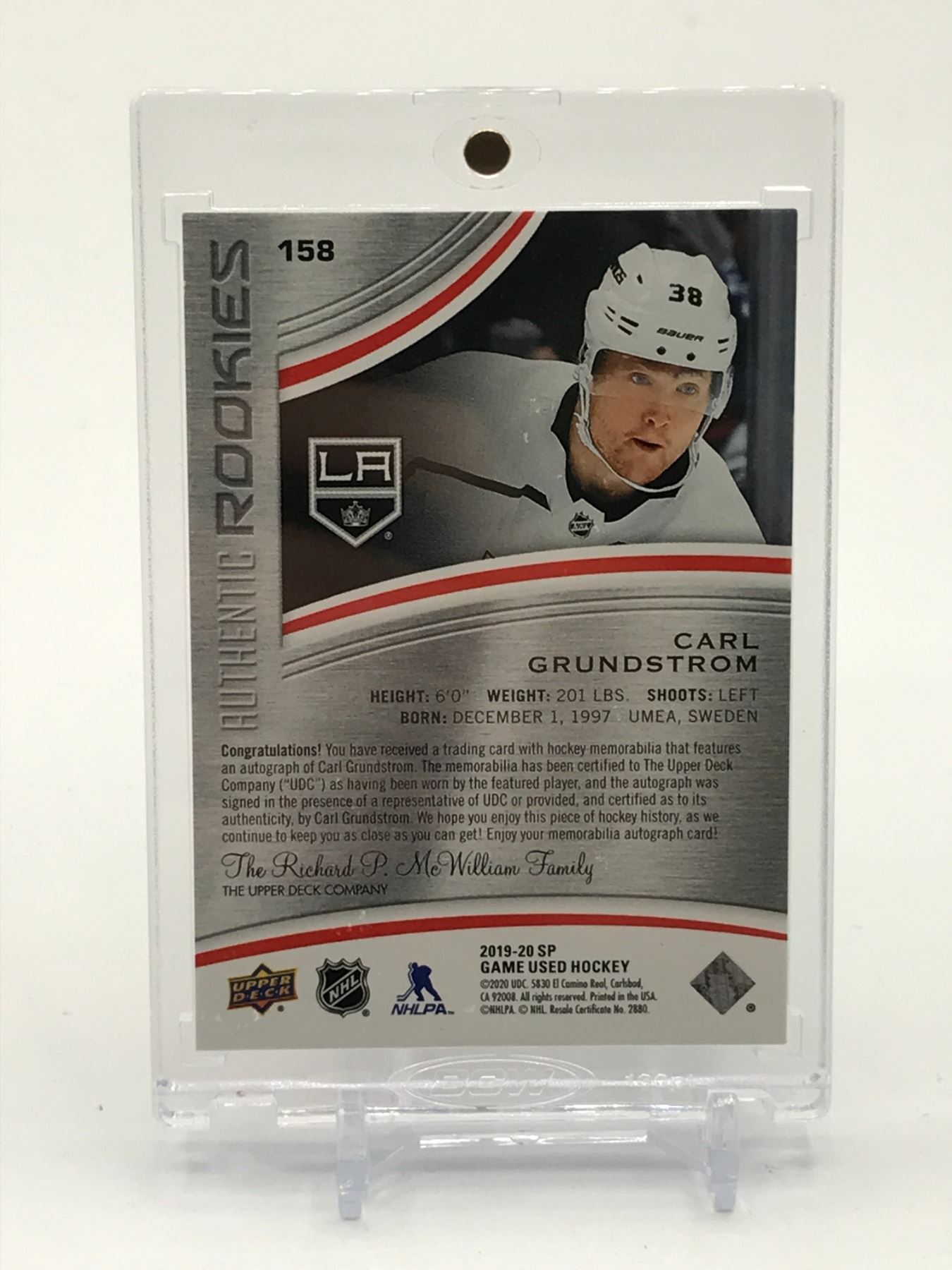 Lot 365 2019-20 UPPER DECK SP GAME USED HOCKEY CARL GRUNDSTROM SIGNED ROOKIE PATCH TRADING CARD 10/15