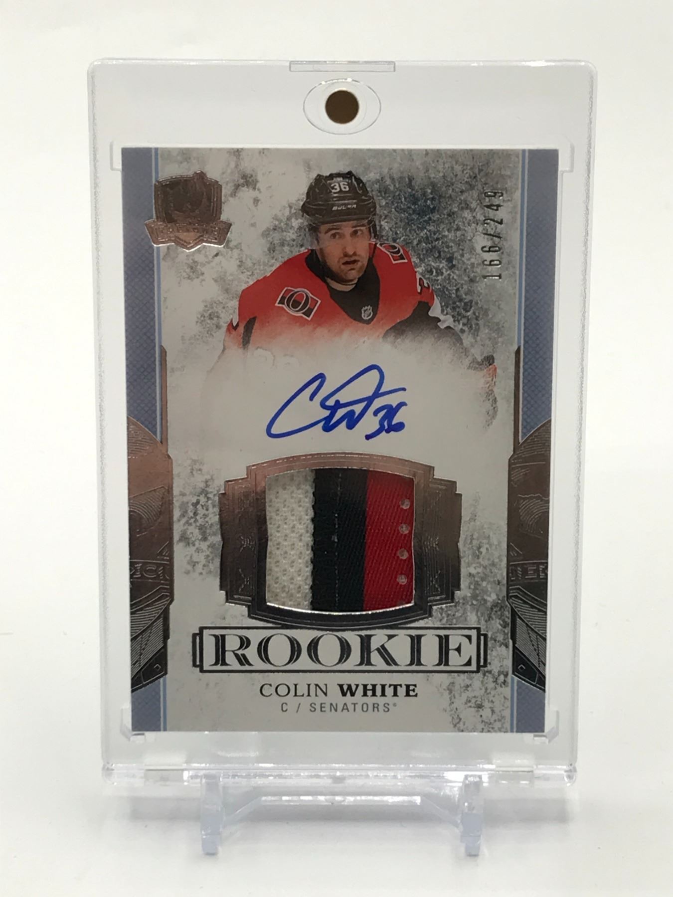 Lot 508 2017-18 UPPER DECK THE CUP HOCKEY COLIN WHITE SIGNED PATCH ROOKIE TRADING CARD 166/249