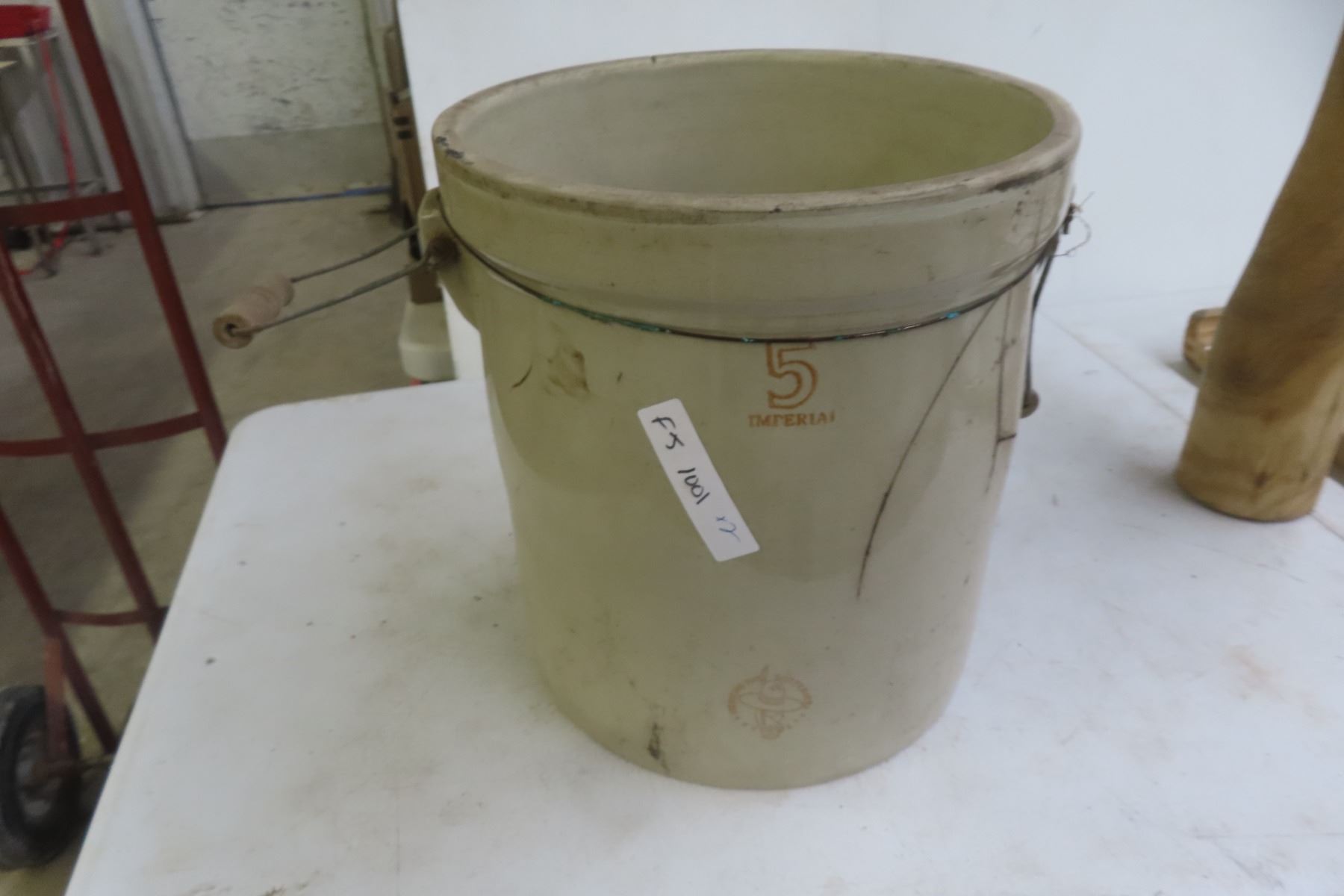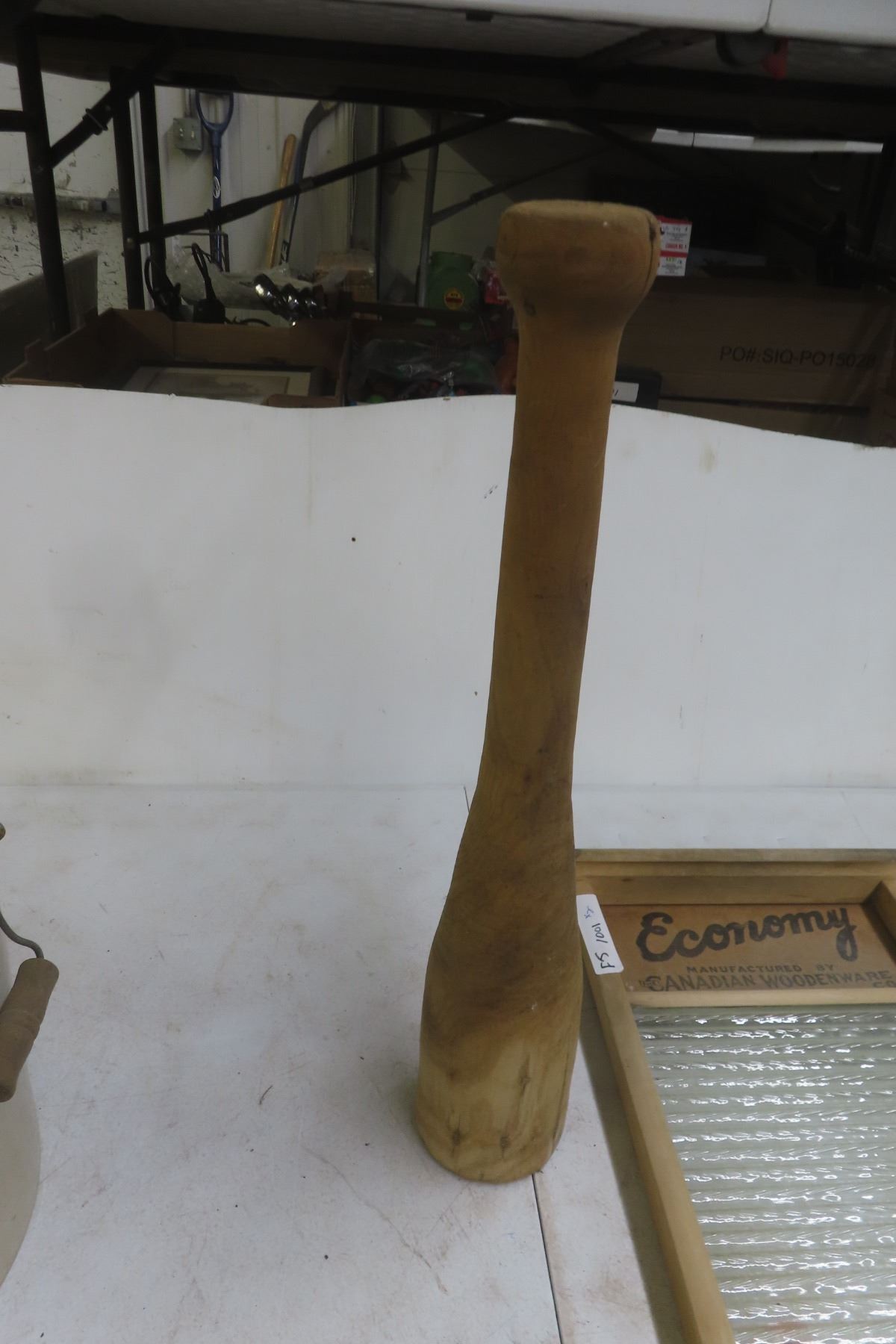 Antique Lot: Medicine Hat Pottery 5-Gallon Crock, Washboard and Wooden Persuader
