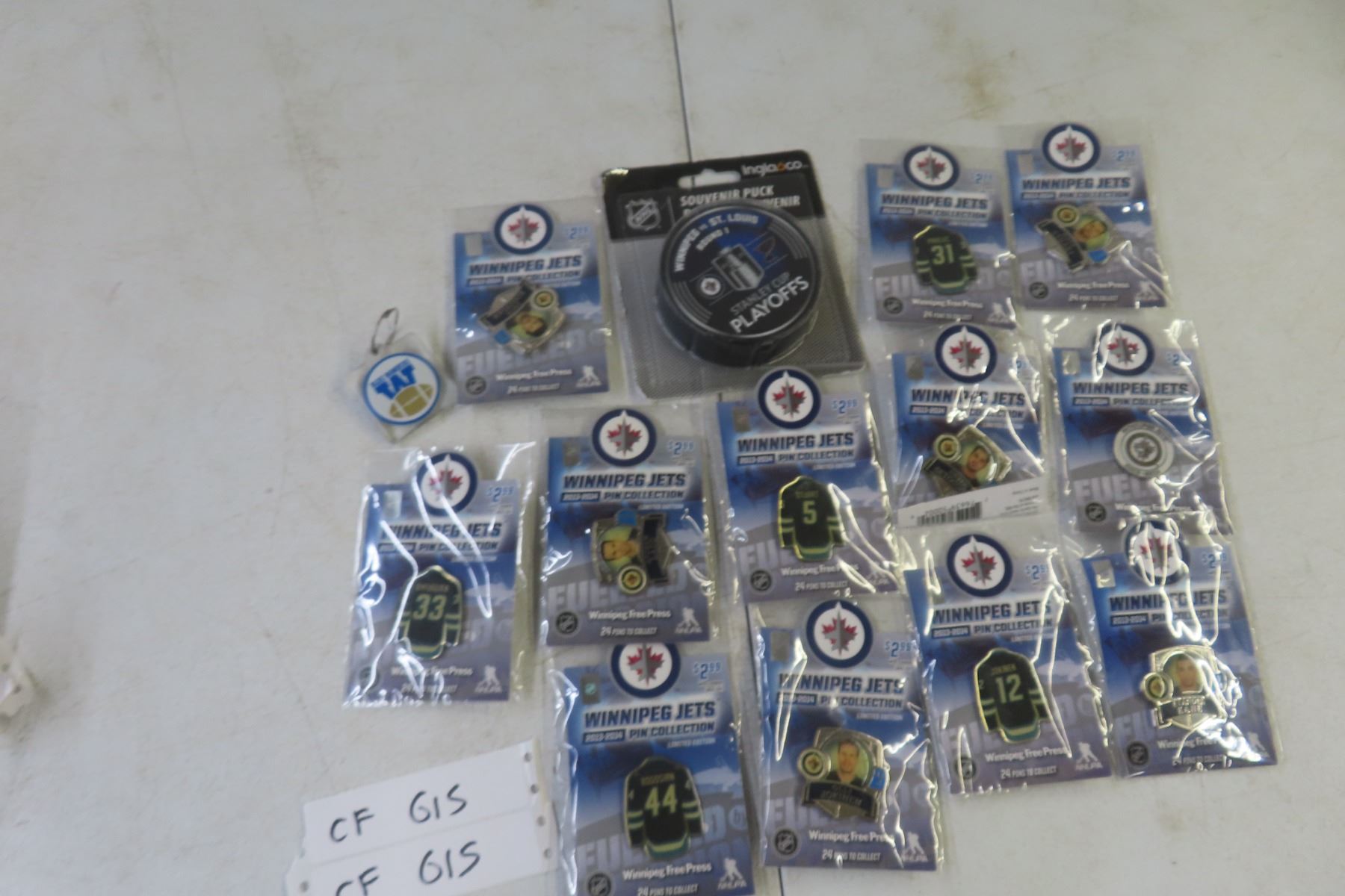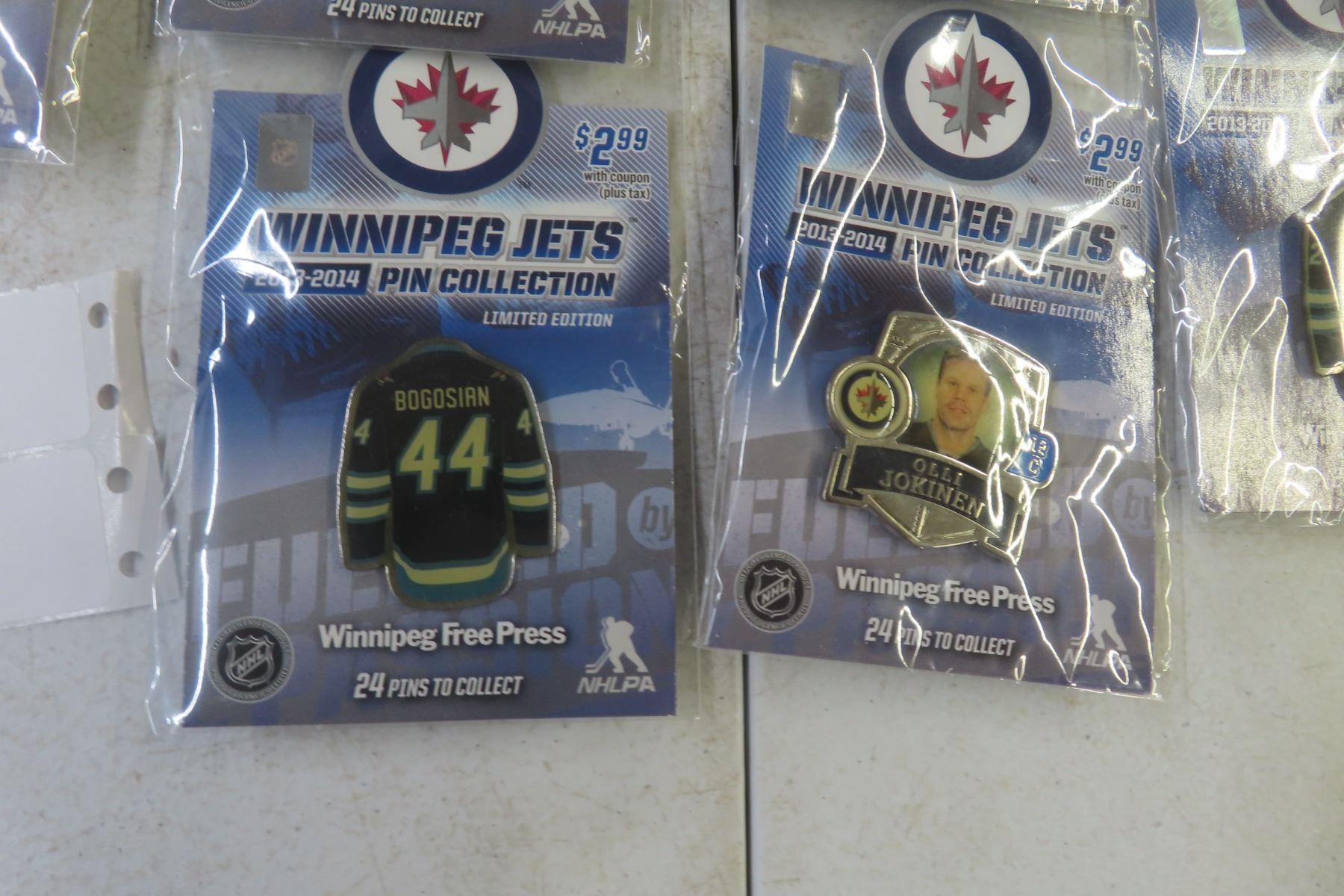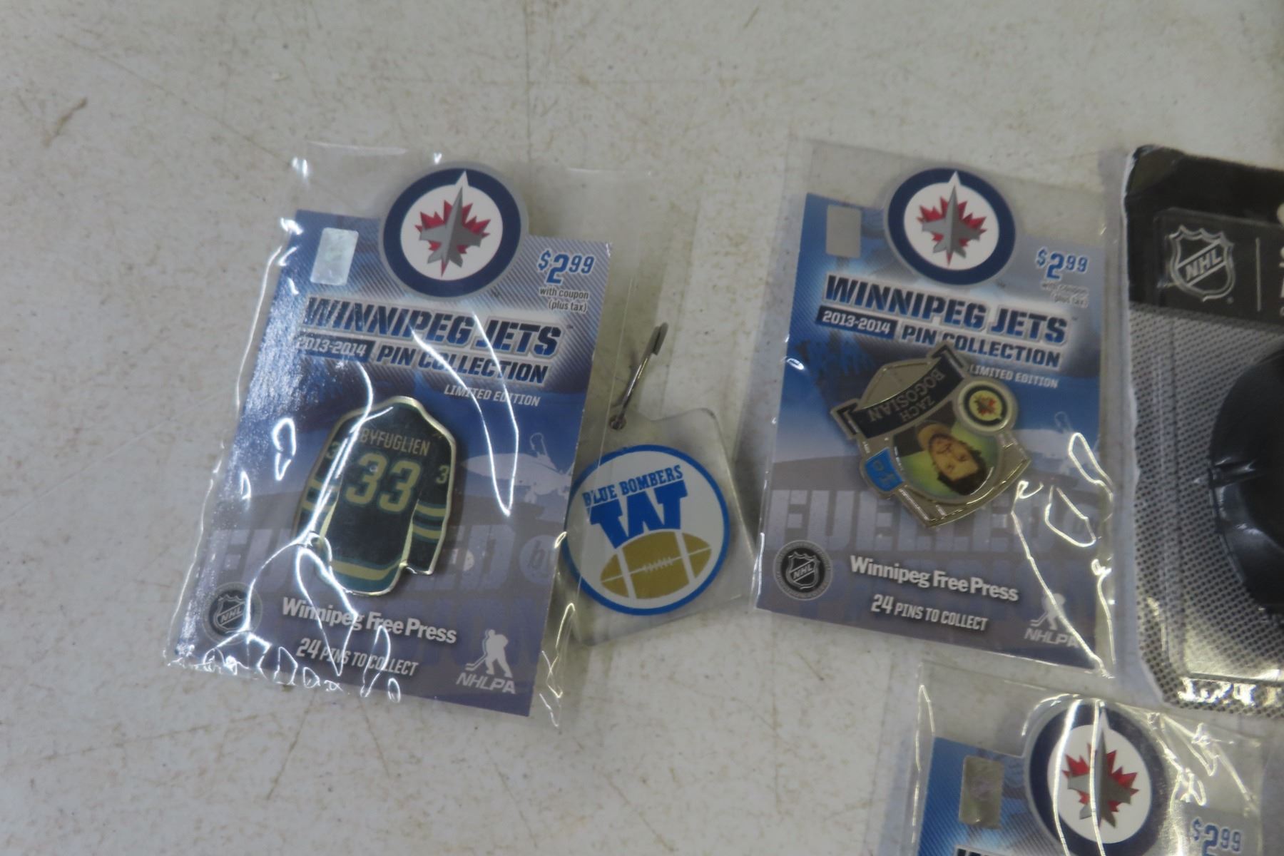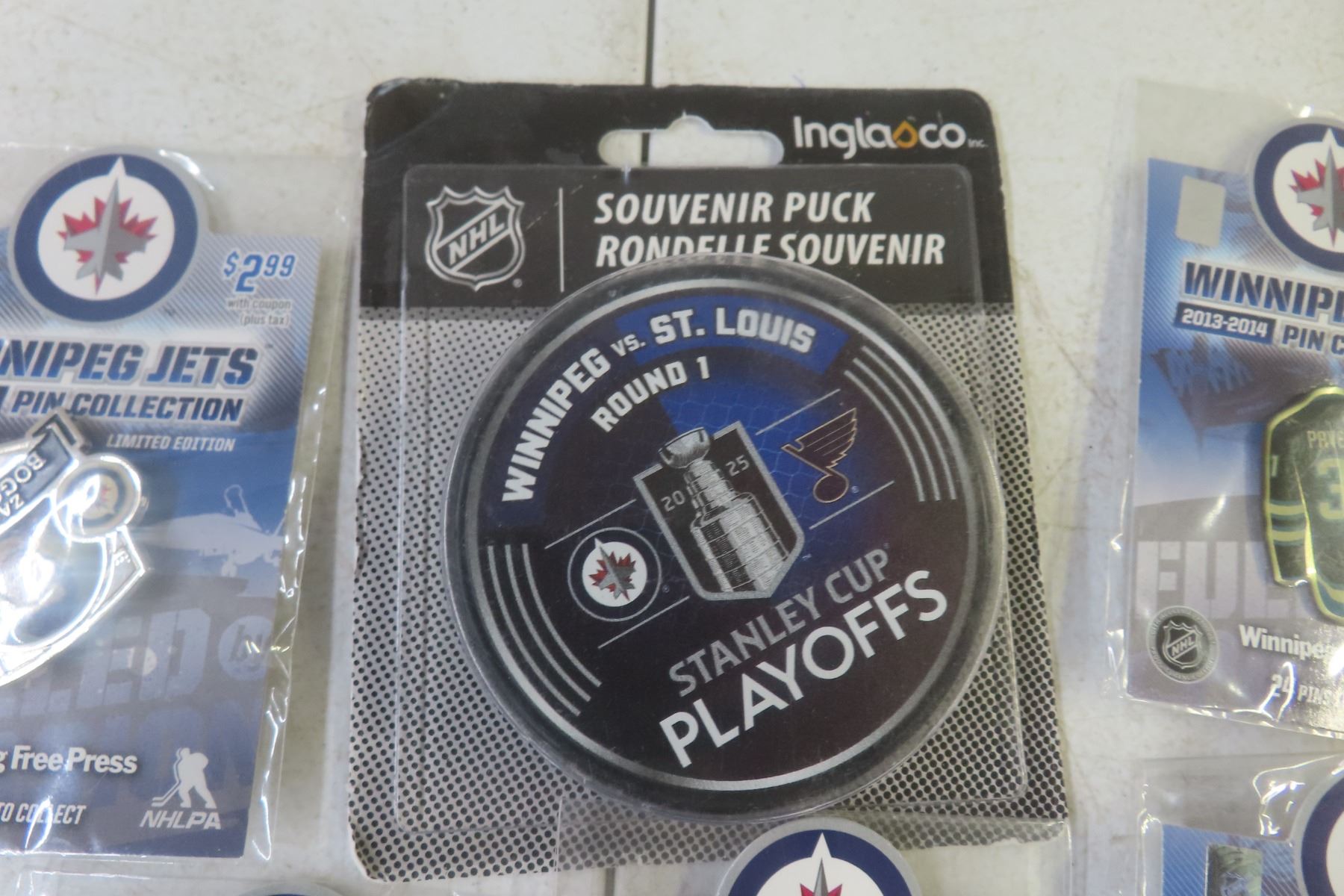 Winnipeg Jets 2013–14 Pin Collection – 12 Pins, 5 Packages; St. Louis Round One Stanley Cup Puck incl. Bogosian