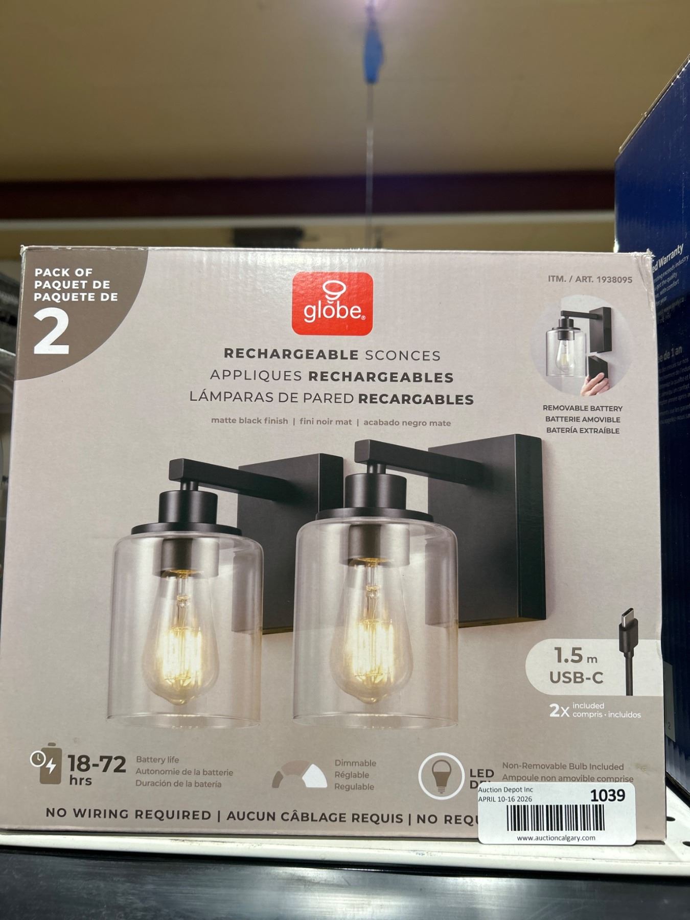 Lot 1039 Globe Electric Rechargeable Glass Wall Sconce, 2-pack