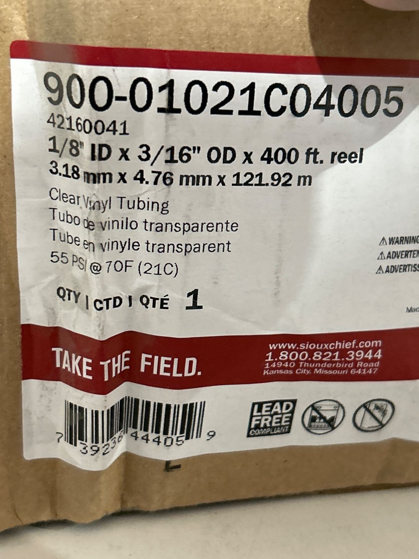 Lot 1170 Sioux Chief Clear Vinyl Tubing 900-01021C04005, 1/8 in ID x 3/16 in OD, 400 ft Reel