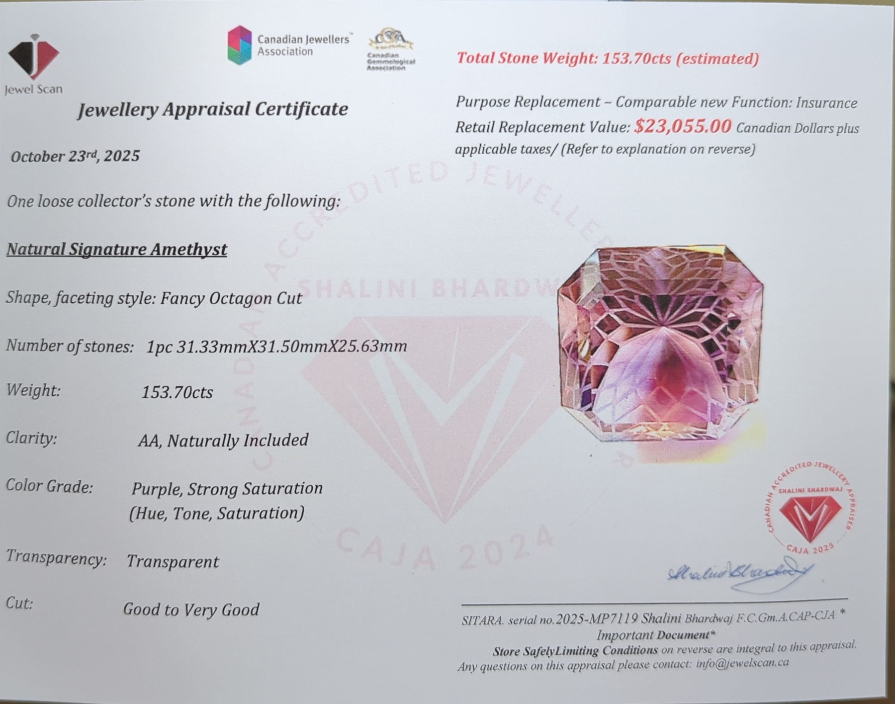 Amethyst 153.7 ct Certified Amethyst gemstone Octagon Cut Value ($23,055 Appraisal)