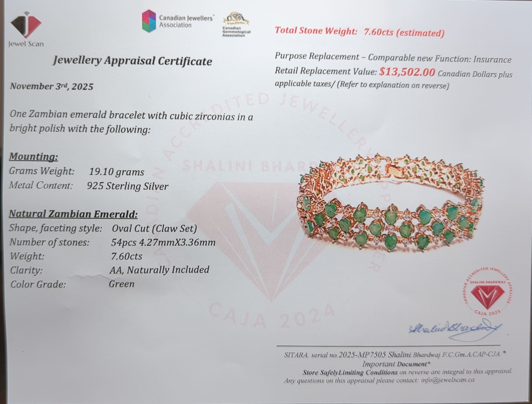 Silver Emerald gemstone Bracelet 19.1 ct Certified Value ($13,502 Appraisal)