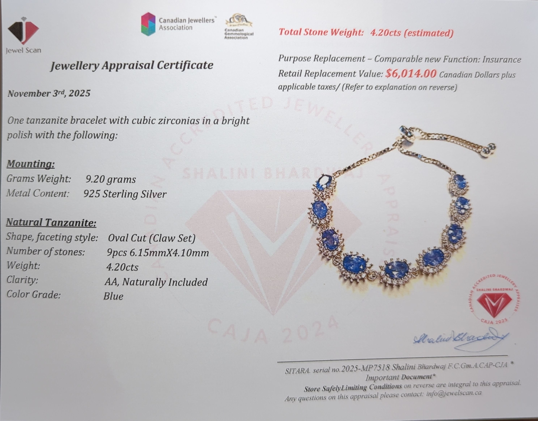 9.2 ct Certified Silver Tanzanite gemstone Bracelet ($6,014 Appraisal)