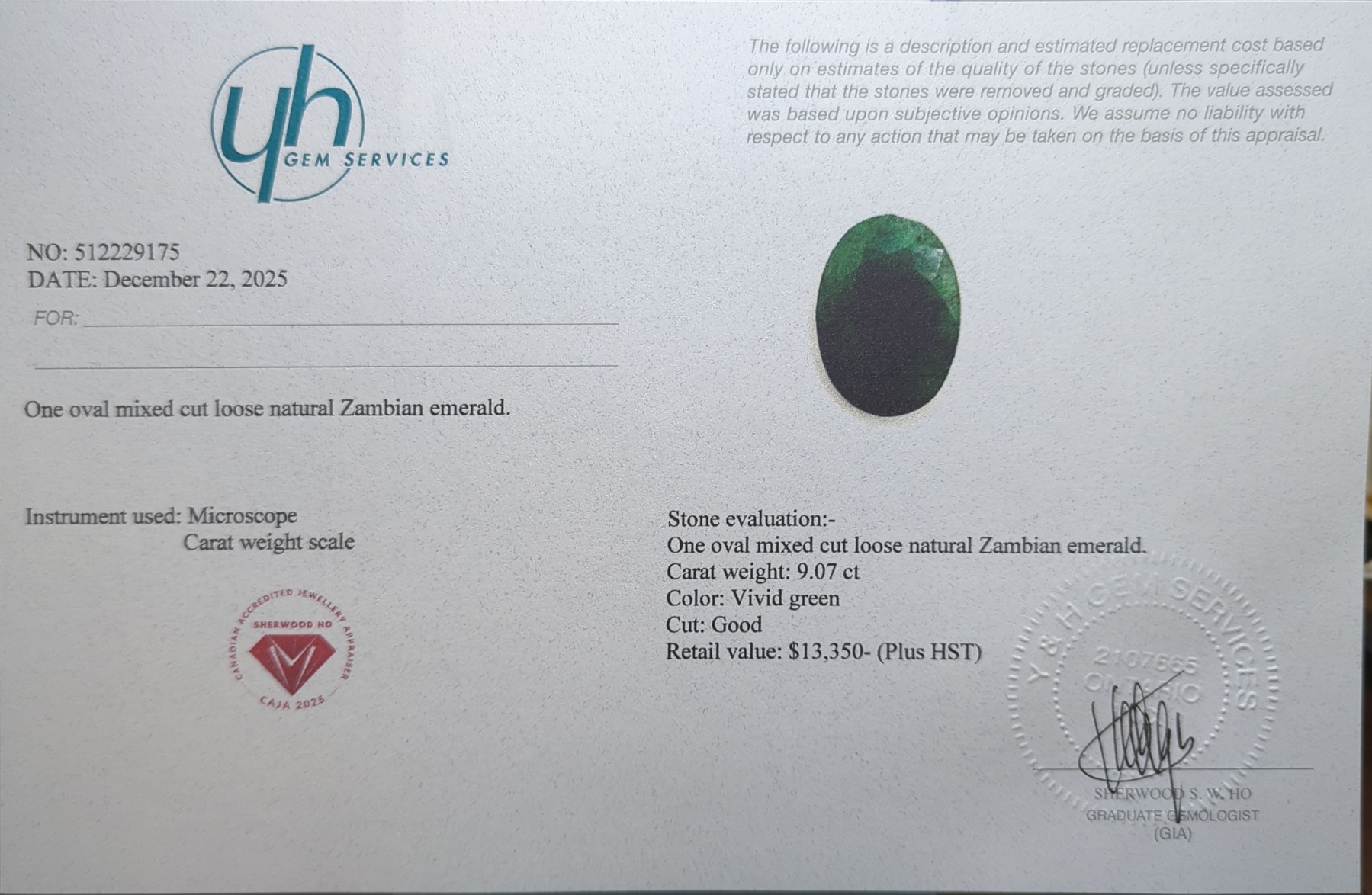 9.07 ct Certified Zambian Emerald gemstone ($13,350 Appraisal)