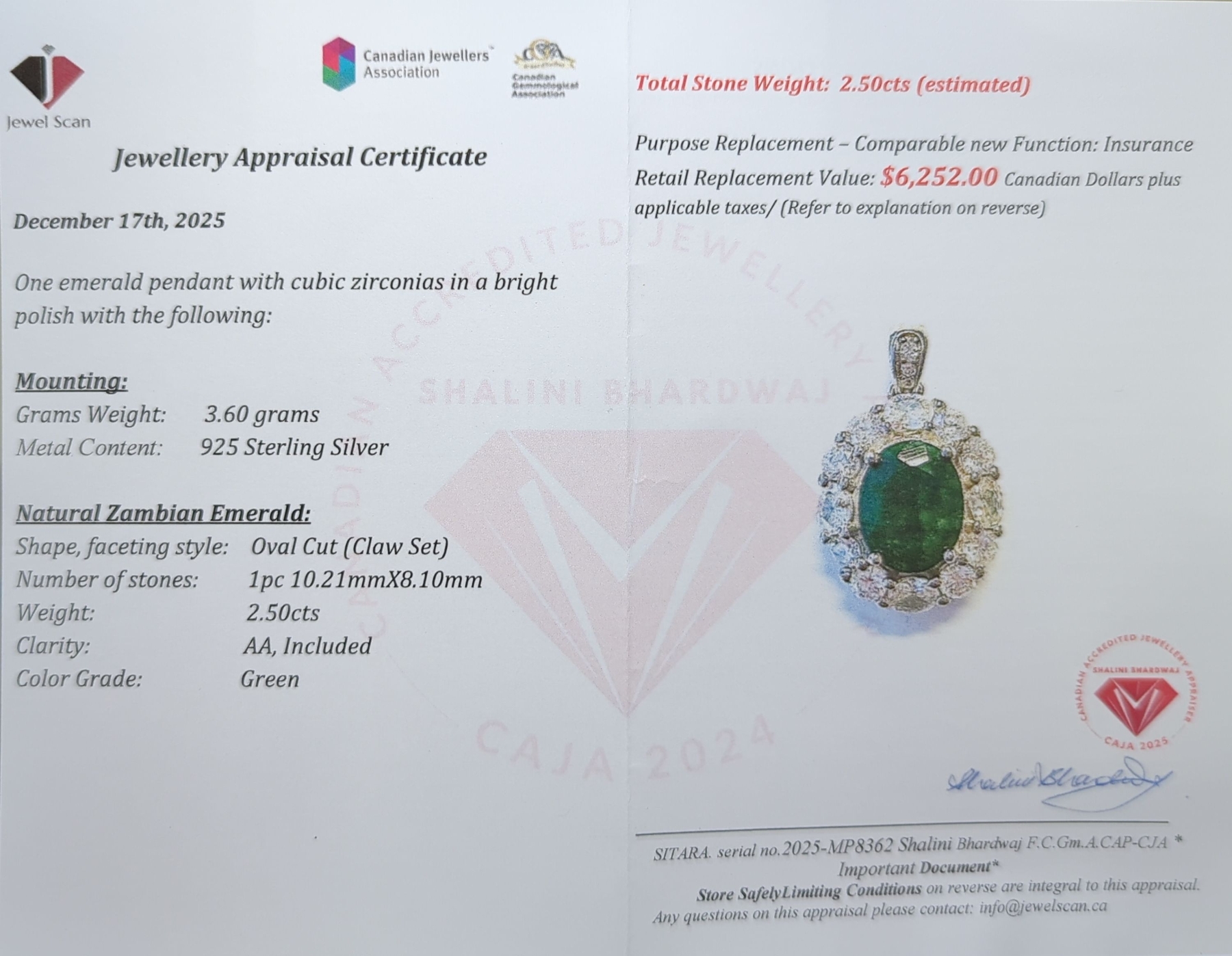 3.6 ct Certified Silver Emerald gemstone Pendant ($6,252 Appraisal)