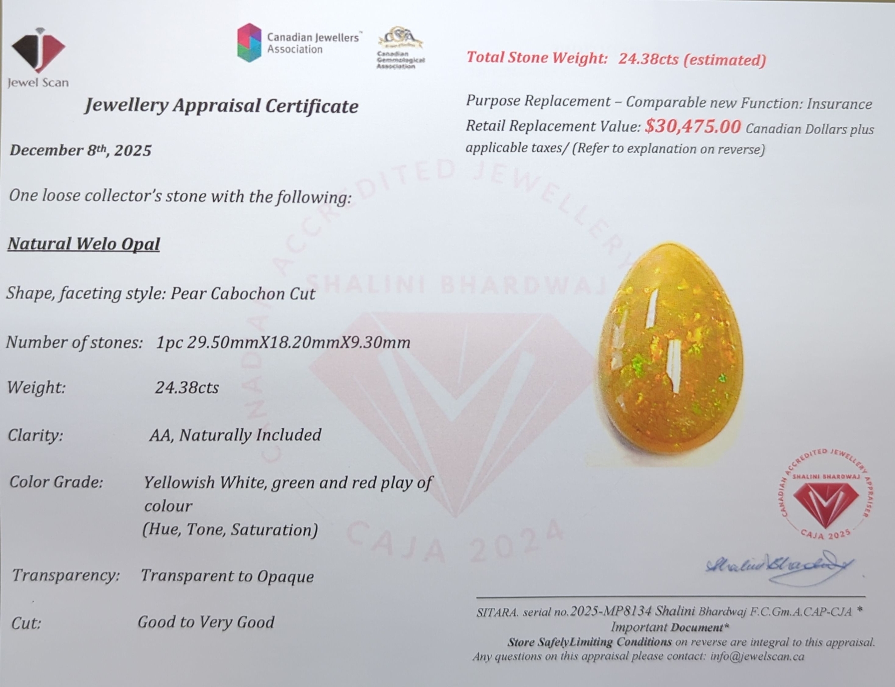 24.38 ct Certified Opal gemstone ($30,475 Appraisal)