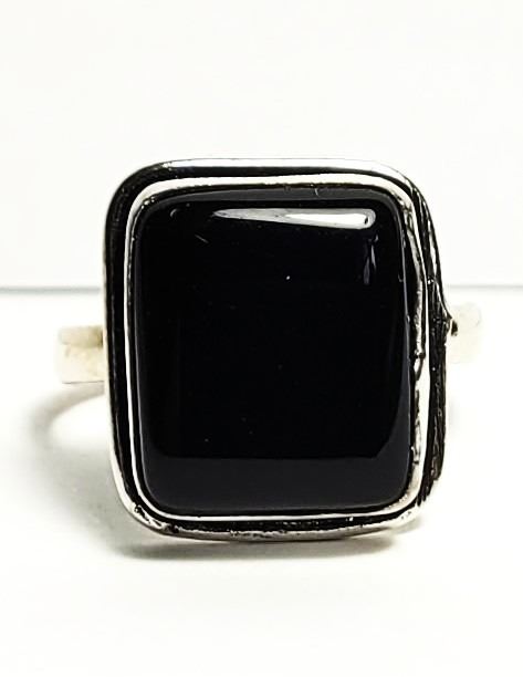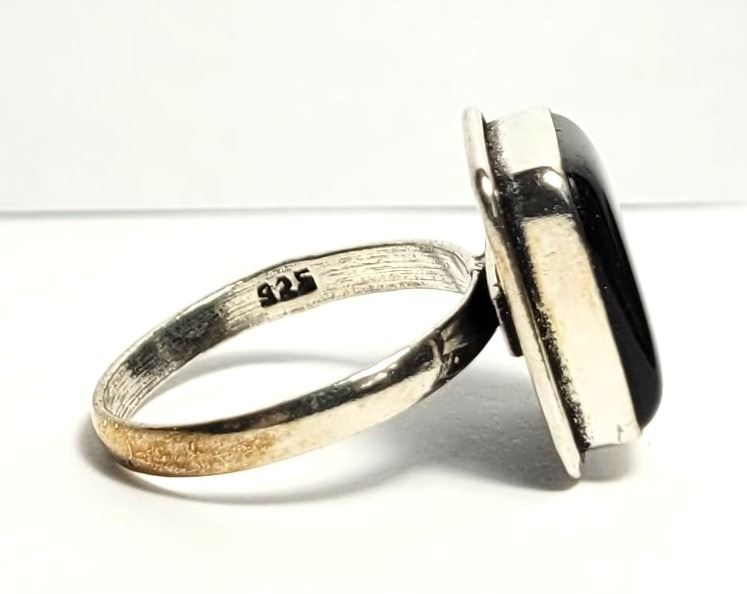 ONYX BEZEL SET SIZE 9 RING, SETTING STAMPED 925. JEWELERY