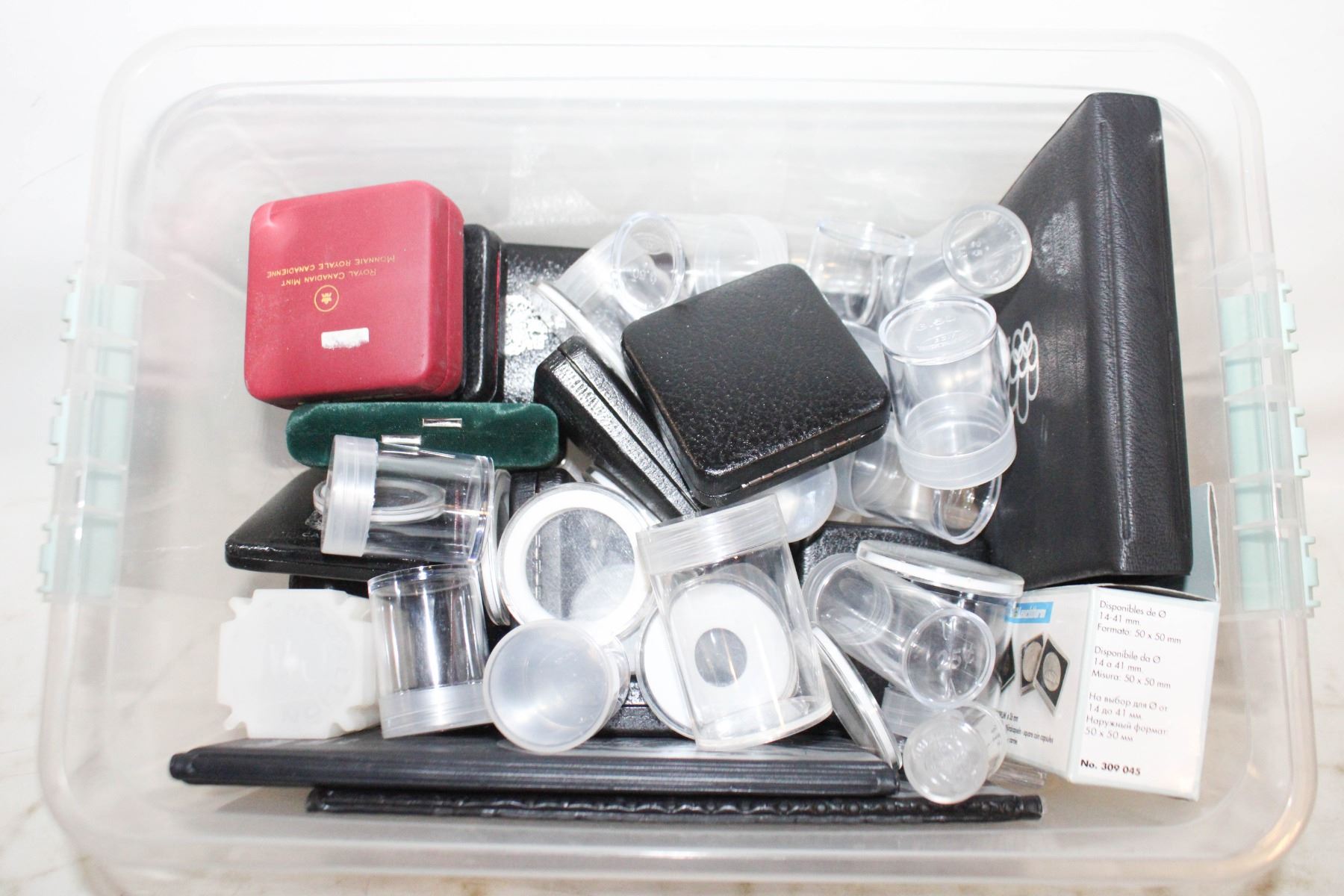 BIN WITH COIN HOLDERS, TUBES AND BOOKS