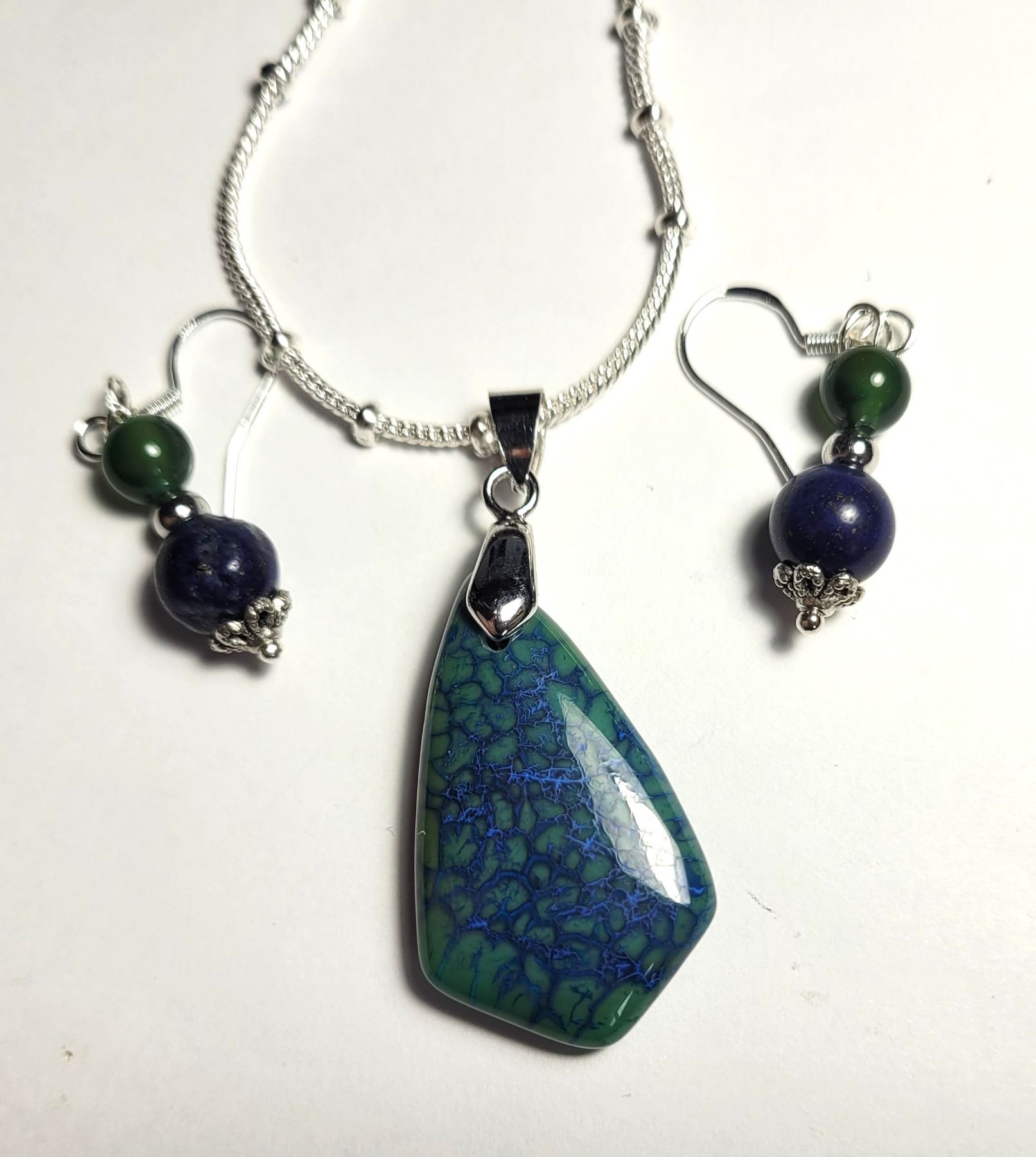 SHAPED DRAGON'S VEIN PENDANT ON 20" CHAIN AND COORDINATING LAPIS LAZULI AND GREEN AGATE DROP EARRINGS. JEWELERY