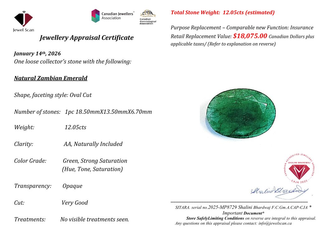 12.05 ct Certified Zambian Emerald gemstone ($18,075 Appraisal)
