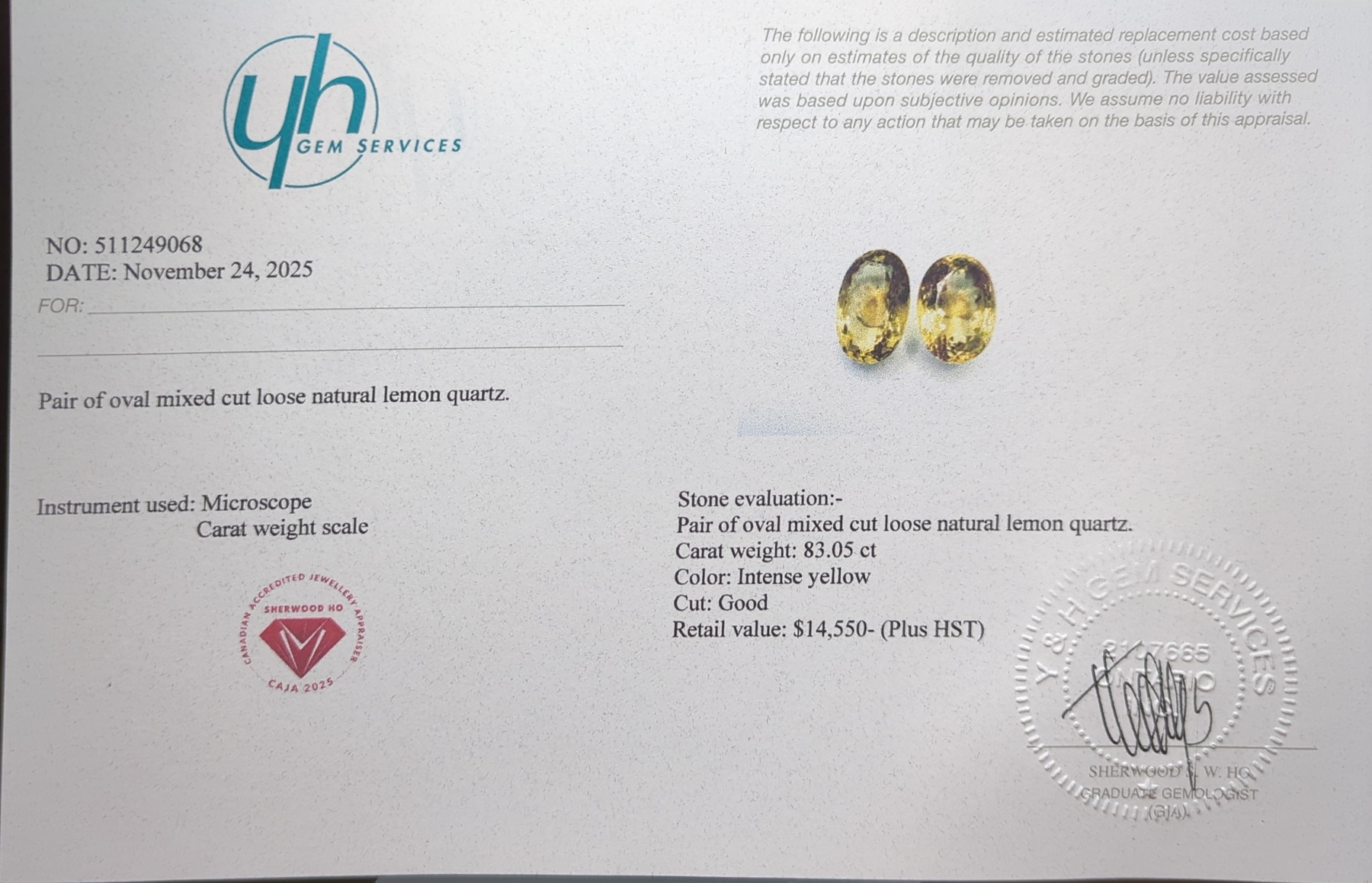 83.05 ct Certified Lemon Quartz gemstone Pair ($14,550 Appraisal)