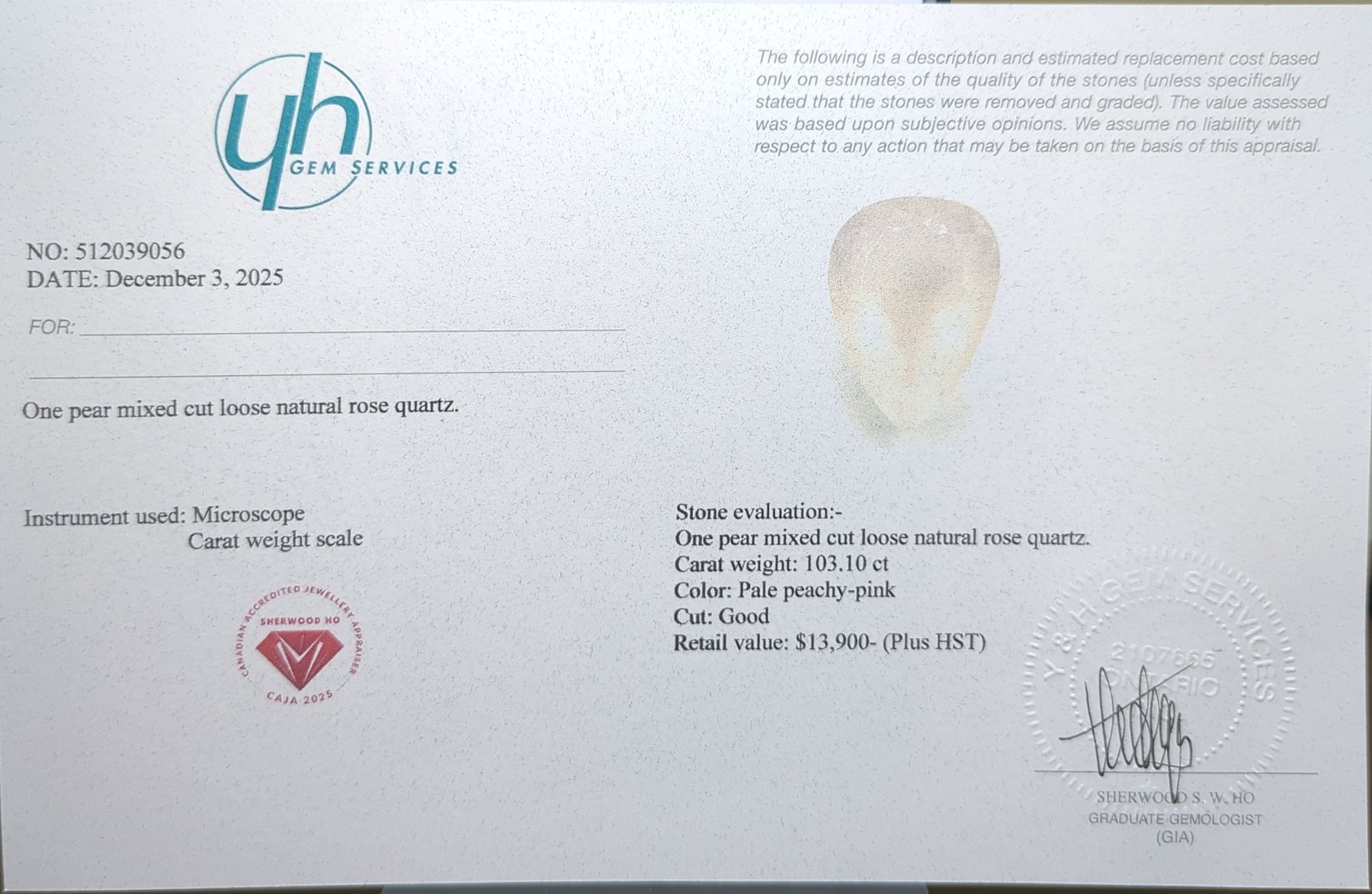 Lot 41 Rose Quartz gemstone 103.1 ct Certified ($13,900 Appraisal)