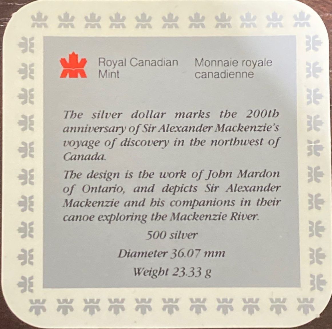 Lot 69 1989 Alexander Mackenzie Proof Dollar 50% Silver 23.33 Grams