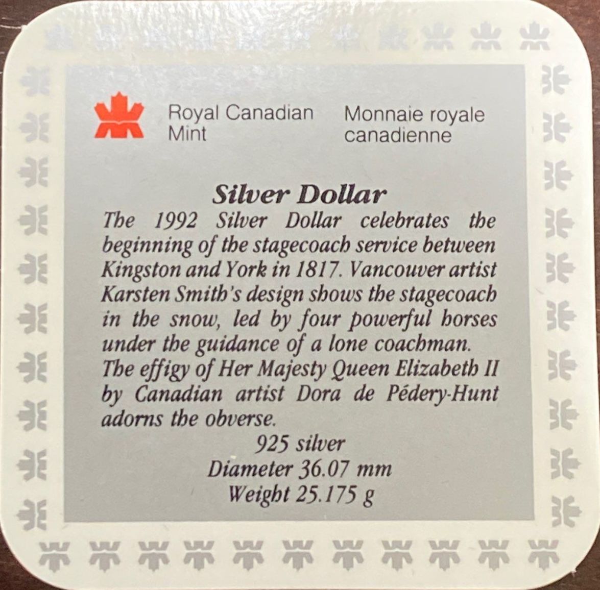 Lot 72 1992 Kingston to York Stagecoach Proof Silver 92.5% Silver 25.175 Grams