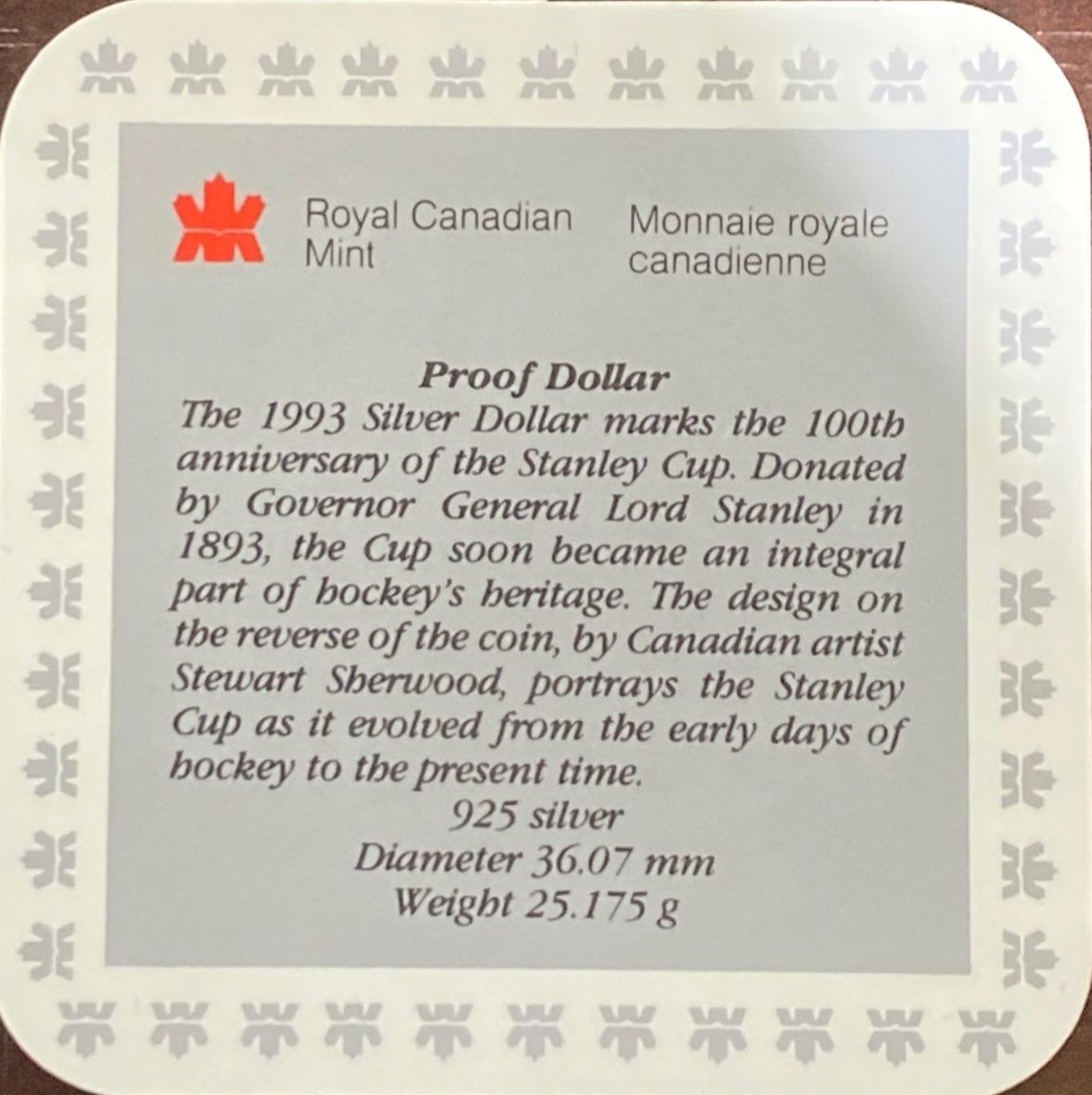 Lot 73 1993 Stanley Cup 100th Anniversary Proof Coin 92.5% Silver 25.175 Grams