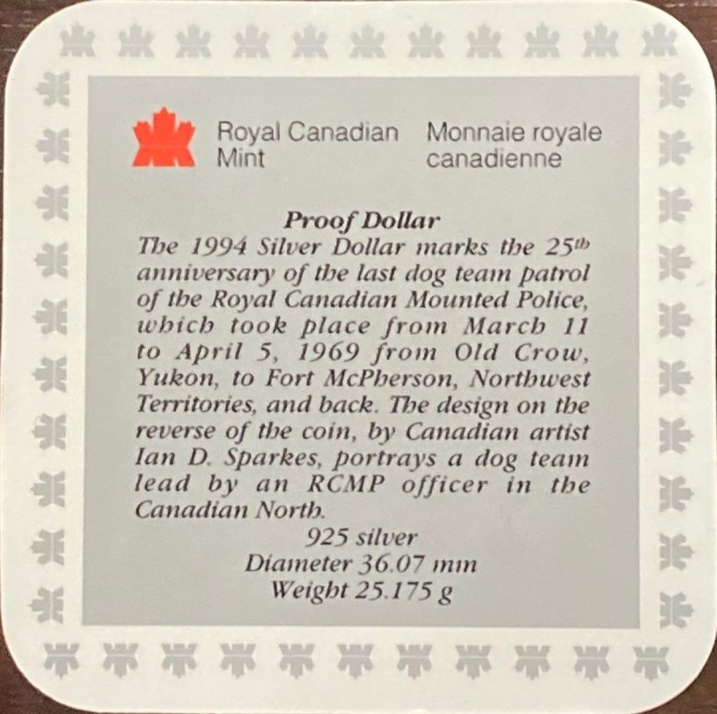 Lot 77 1994 RCMP Dog Patrol Team Proof Silver Coin 92.5% Silver 25.175 Grams