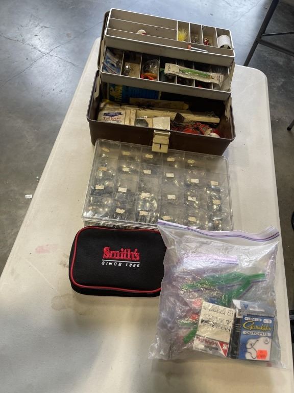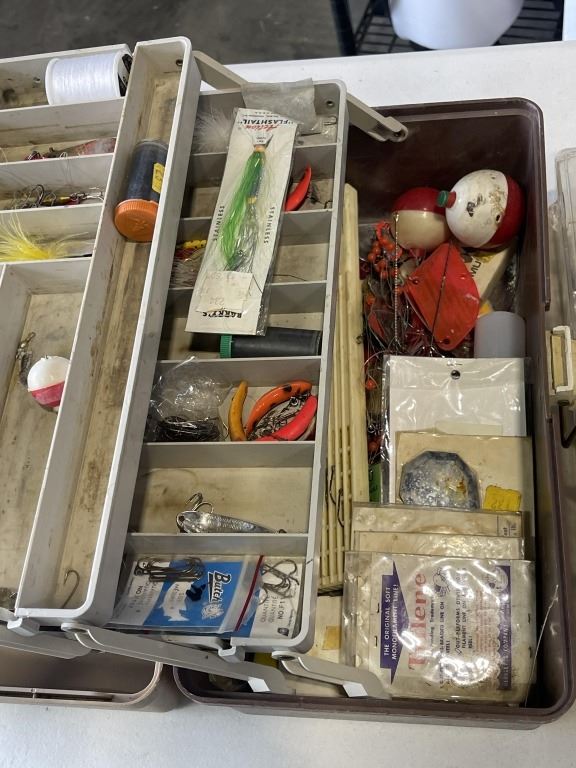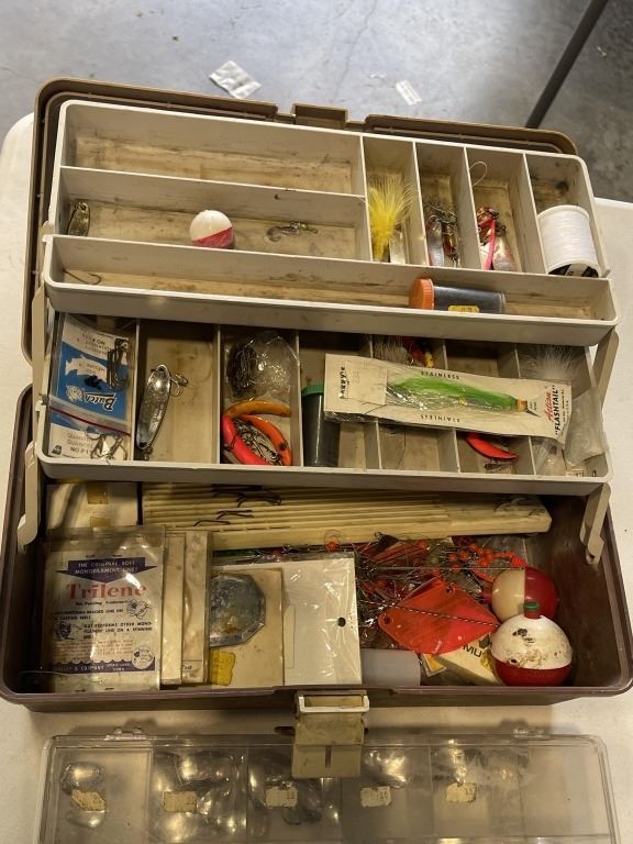 FISHING TACKLE BOX WITH CONTENTS AND ORGANIZER OF SPOONS, FLY TYING GEAR ETC