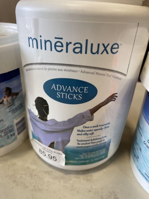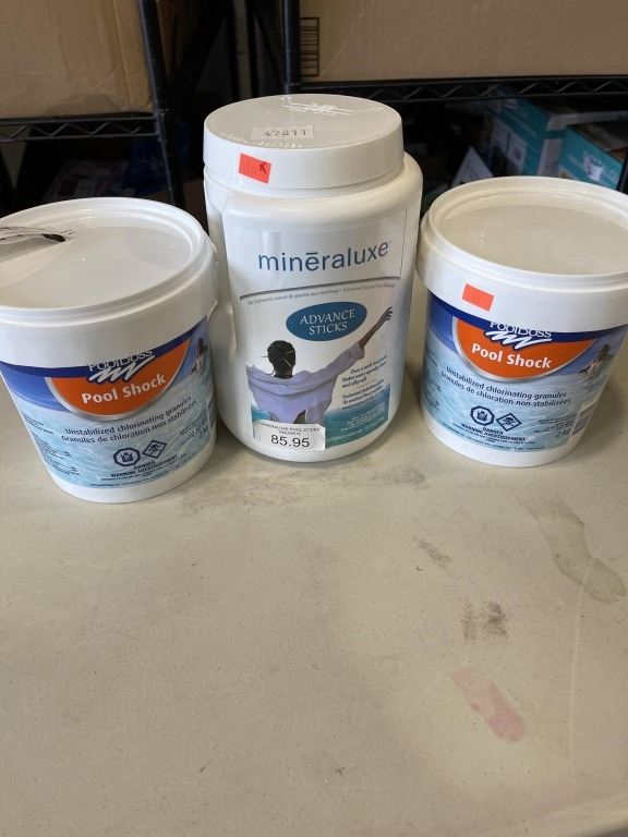 Lot 97 3 NEW CONTAINERS OF POOL CHEMICALS POOL SHOCK AND MINERALUXE ADVANCE STICKS