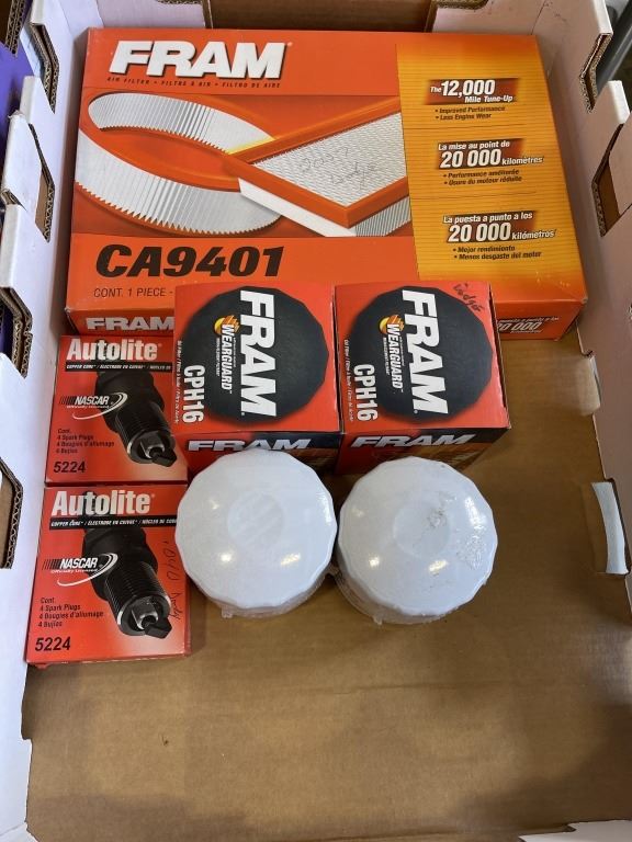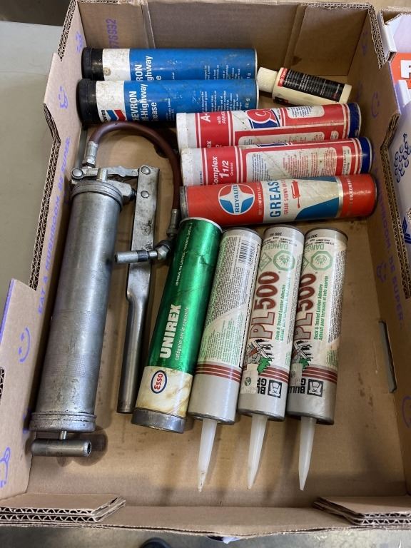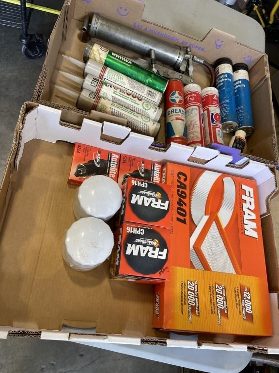 TRAY OF NEW GREASE AND PL, GREASE GUN, AND TRAY OIF NEW FRAM FILTERS