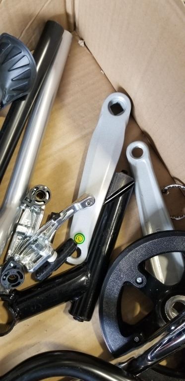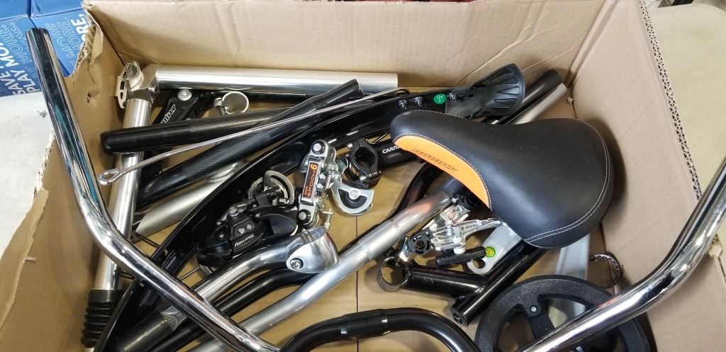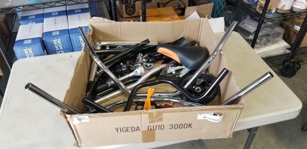 Lot 120 BOX OF NEW BIKE PARTS - SEATS, HANDLE BARS, REFLECTORS, ETC