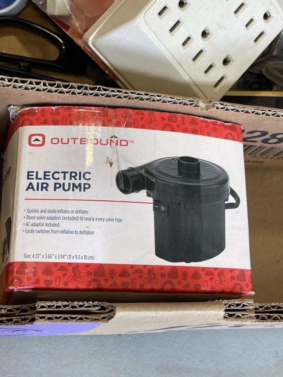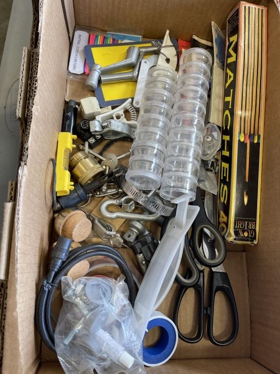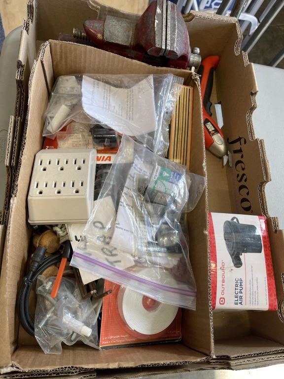 Lot 158 TRAY OF SHOP TOOLS AND HARDWARE INLCUDING BENCH VISE, ELECTRIC AIR PUMP
