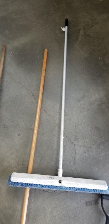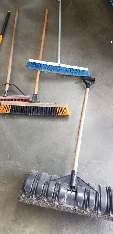 BUNDLE OF SHOP BROOMS AND SNOW SHOVEL ETC