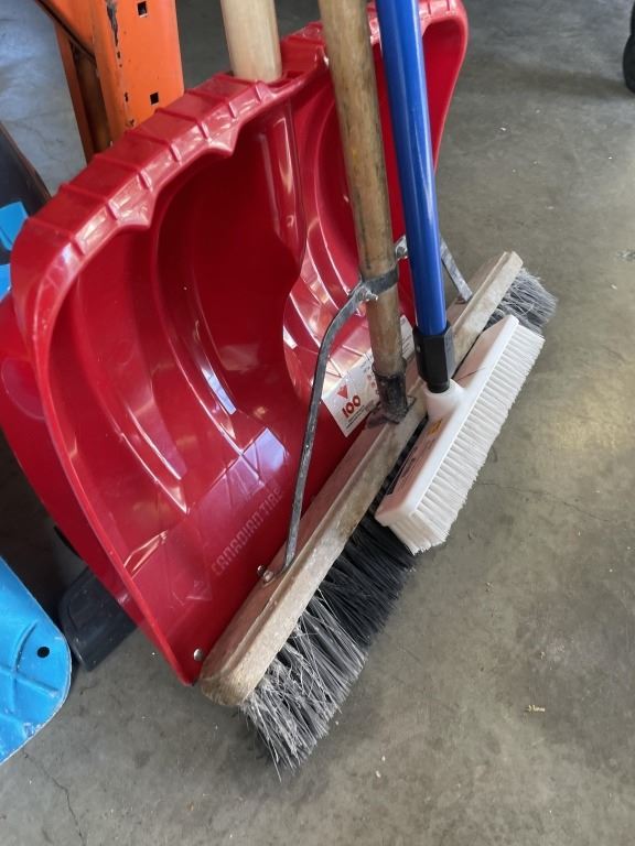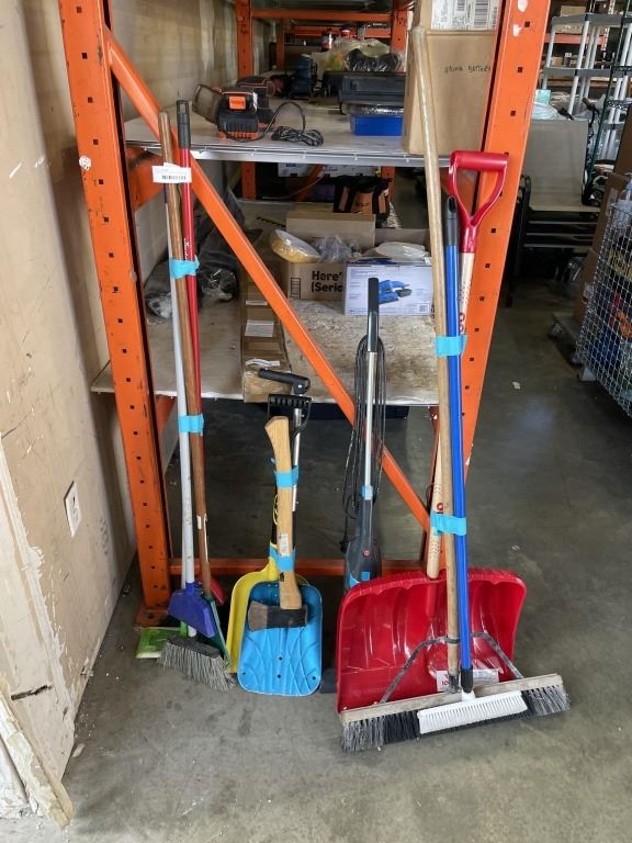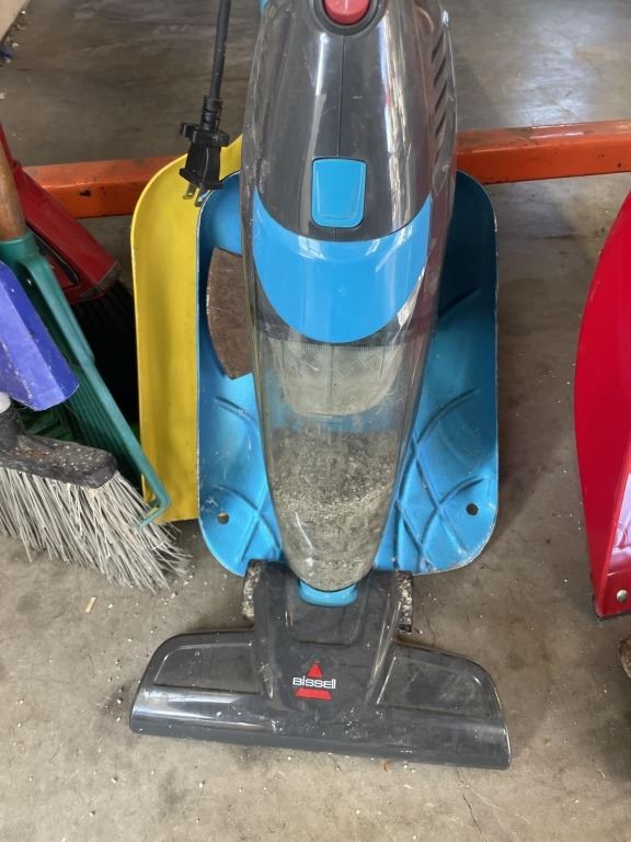 Lot 163 3 BUNDLES OF BROOMS, SHOVELS AND GARDEN TOOLS AND BISSEL VACUUM