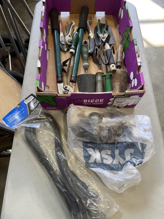 Lot 186 TRAY OF GARDEN TOOLS AND NEW BUNGEE CORDS ETC