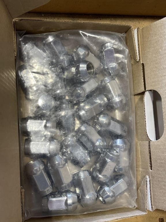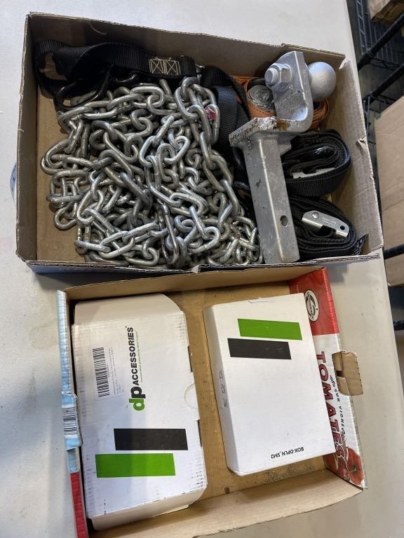 Lot 188 TRAY OF CHAIN, RATCHET STRAPS, HITCH AND TWO BOXES OF LUG NUTS