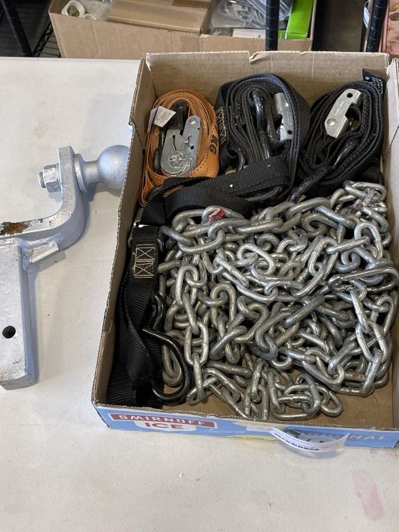 TRAY OF CHAIN, RATCHET STRAPS, HITCH AND TWO BOXES OF LUG NUTS