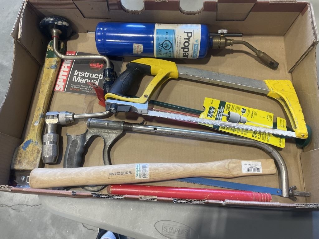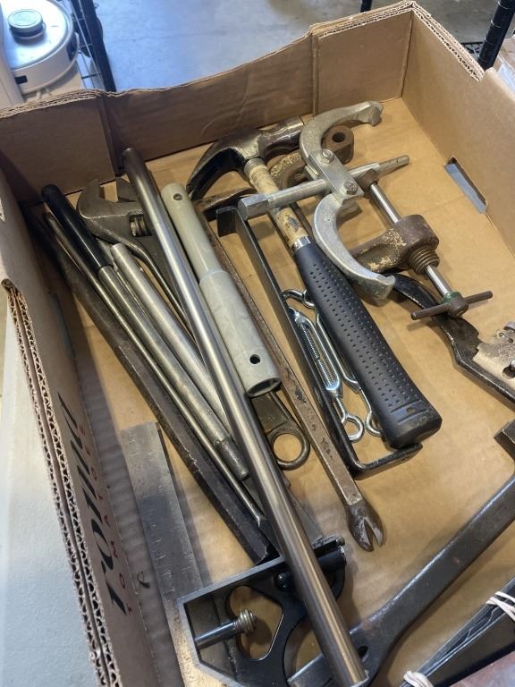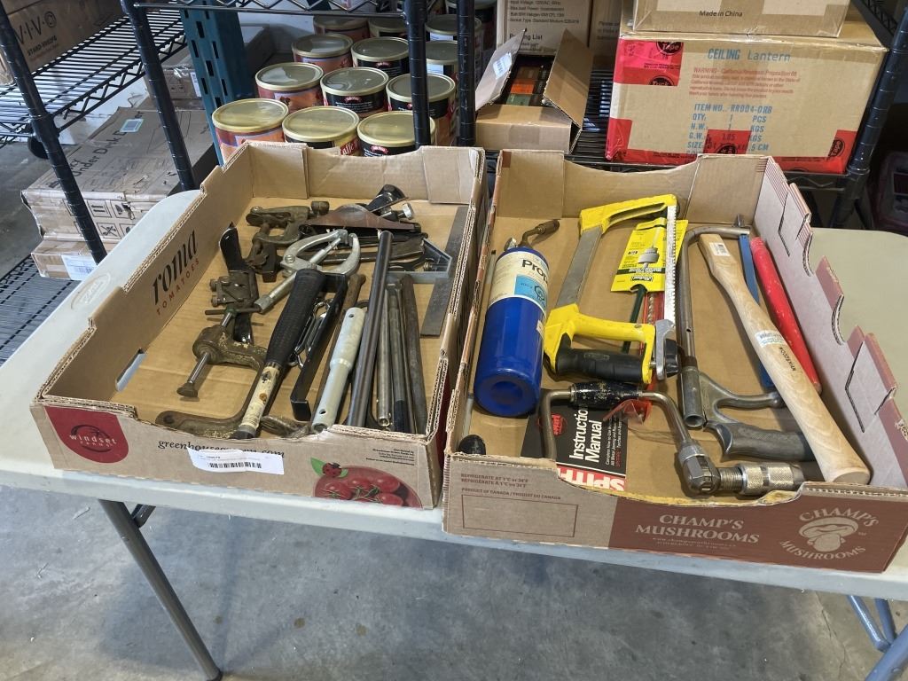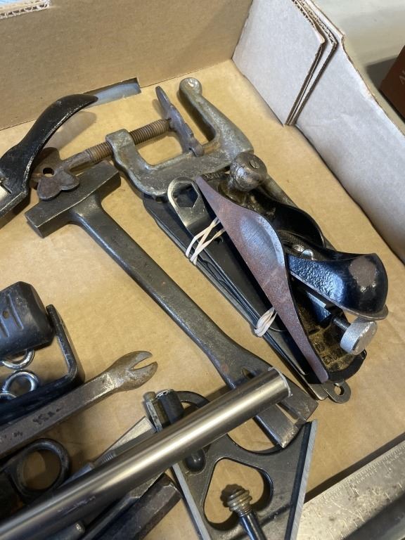 Lot 192 2 TRAYS OF ASSORTED HAND TOOLS, WOOD PLANE, HAMMER AND NAIL PULLERS ETC
