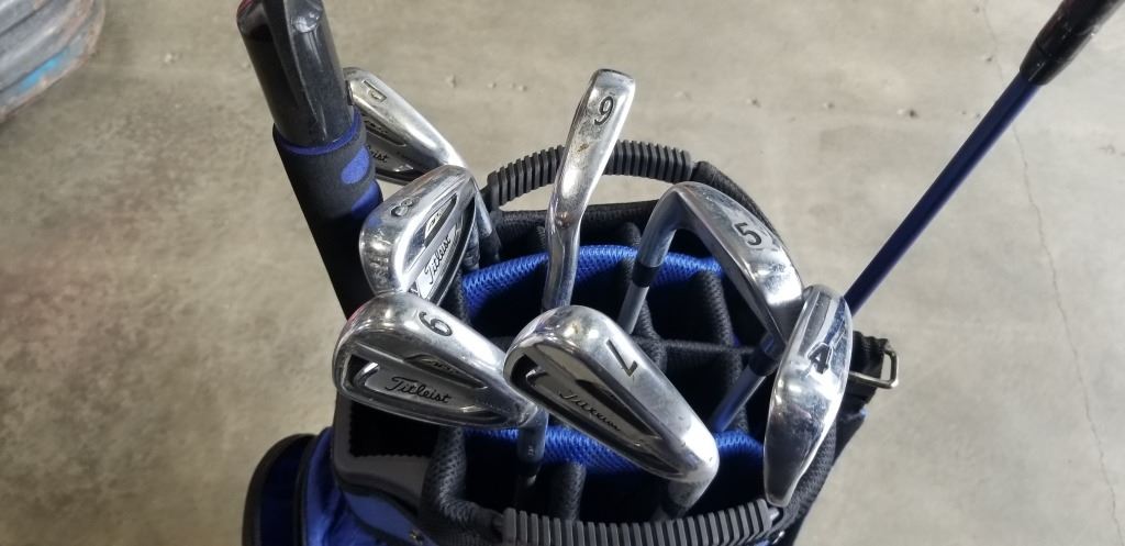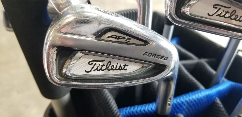 SET OF TITLEIST AP2 FORGED IRONS, TAYLORMADE BLUIE GOLF BAG AND COBRA S3 DRIVER, RIGHT HANDED