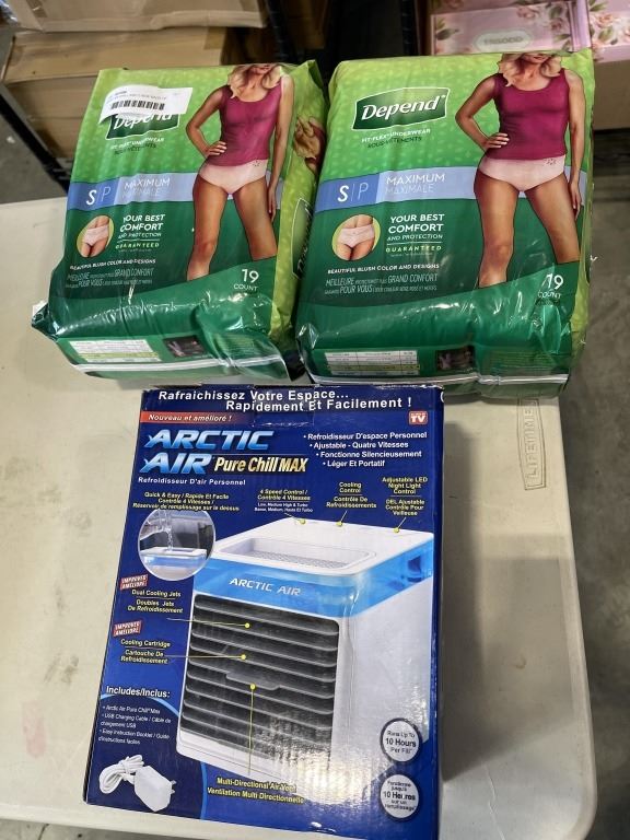ARTIC AIR CHILL AND 2 NEW BAGS OF DEPENDS SIZE SMALL